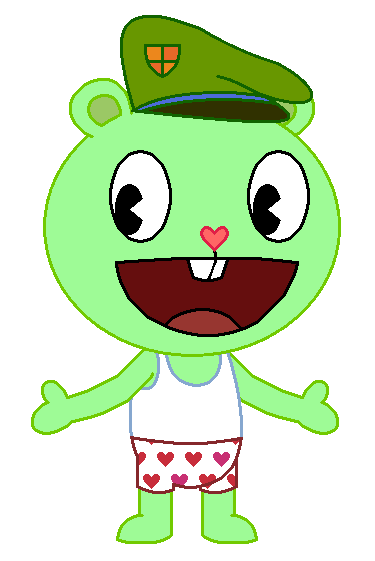 Here's something cute, adorable and funny I did. It's Flippy from HTF/Happy Tree Friends in underwear that males or females actually wear under their clothes. He is wearing Disco Bear's white sleeveless shirt/sleeveless top that is a tank top and tank shirt undershirt and A-shirt and vest and singlet from his workout and exercise and athletic and fitness and sports clothing/clothes in place of his best friend's white tank top from different Happy Tree Friends TV Series Episodes/Shorts along with Splendid's white undershorts and shorts and boxers underwear and underpants and undies with dark red and dark pink hearts on them from the episode: Gems the Breaks. Looks cute for a man bear to wear boxers and undershirt, doesn't it? And also, I forgot to tell you that the undershirt that he's wearing is from the episode: Ipso Fatso.