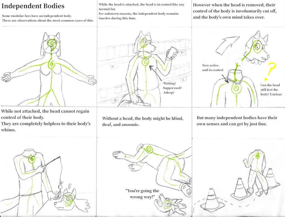 Fergus here again with another one of these observation logs. The last one with the hydra implied the next one would be about rotating control. This isn't exactly what I had in mind. I'll have a more complicated case study for that. This one was simple and fun to write about though. A fur whose body has an independent mind of its own. Being modular sounds like a hassle sometimes. ------------------------------------------------------------- Sorry it's been so long since the last one. I think this one is much easier to read at least. I didn't do the best job with the hair. I guess she's got... some kind of dreadlocks or.. tentacle hair somehow. I'm still proud of how the second panel came out.