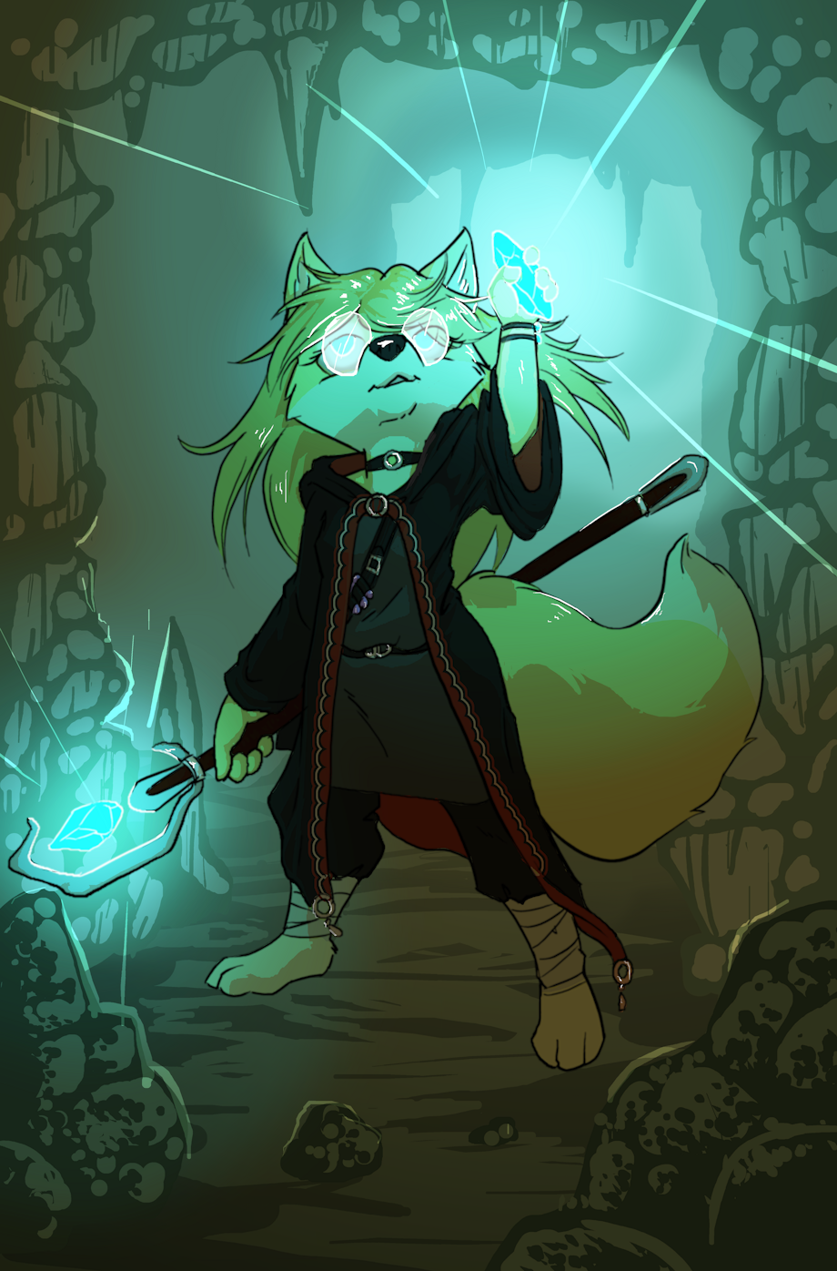 Oh my. And quite an impressive wizarding fox she makes, too! Love the outfit, especially that swanky robe and choker. The staff looks cool as all heck, too, and that pose and expression are fantastic! This is a girl who has unlimted power at her fingertips and is loving it! The lighting / glow effects from her staff and the crystal in her hand are beautifully done, too, as are the stones of the cave behind her. It's neat to see Poly progressing on her wizardly path and this one turned out amazing!