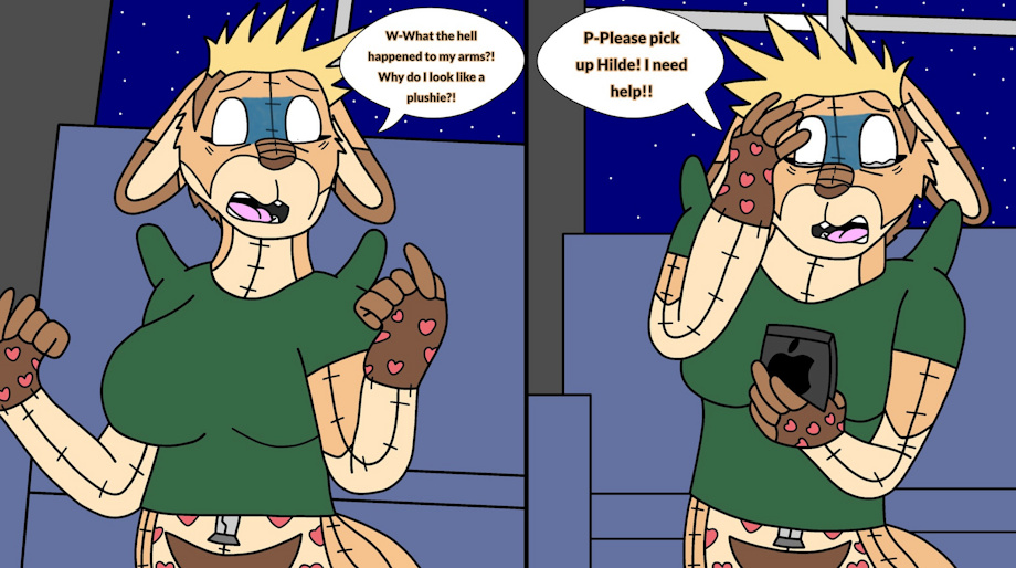 Part 4: Adrian is still quite frantic as she tries to tell Hilde what happens before getting cut off by Hilde asking why the kangaroo seems to be frantically talking to her. Adrian calms down just enough to explain what happened to her leaving Hilde in shock. Adrian is at a loss on what to do since she has no idea how this happened or why this happened in the first place. Hilde's thoughts may be a bit... uhh... vulgar to say the least as she questions the veracity of Adrian's claims of being turned into a plushie randomly.