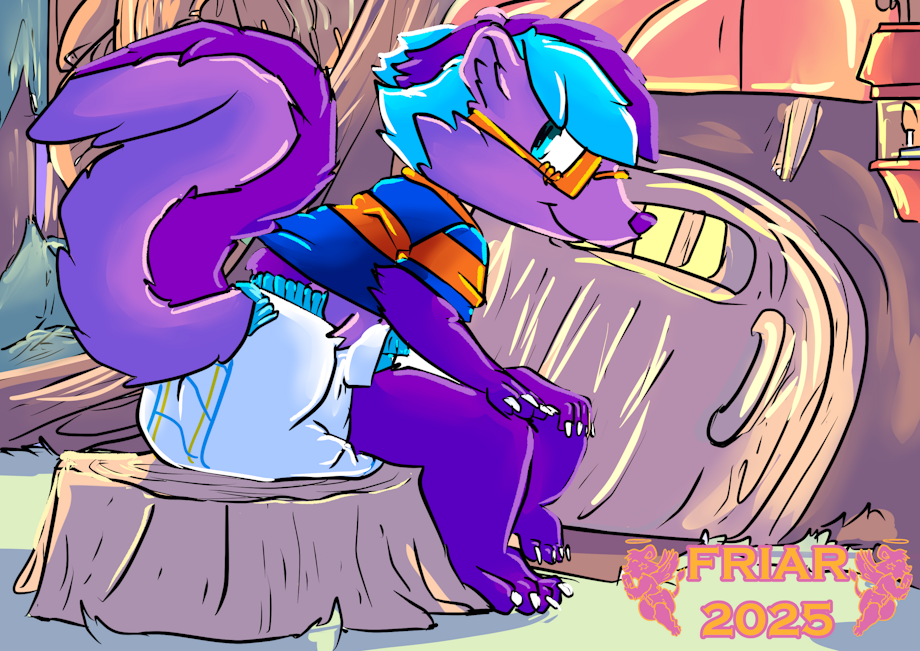 Illustration of Everett the wet and messy diapered skunk seated on a tree stump in front of tree home in a forest with a lantern lighting up the area.