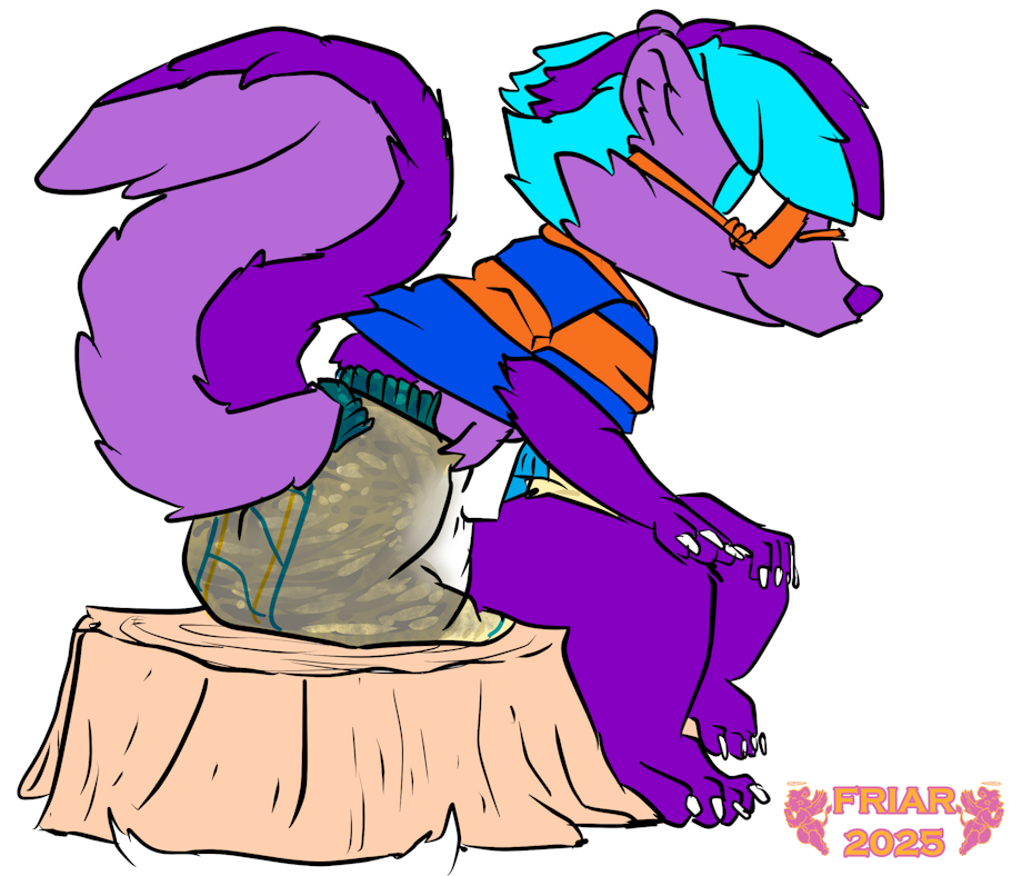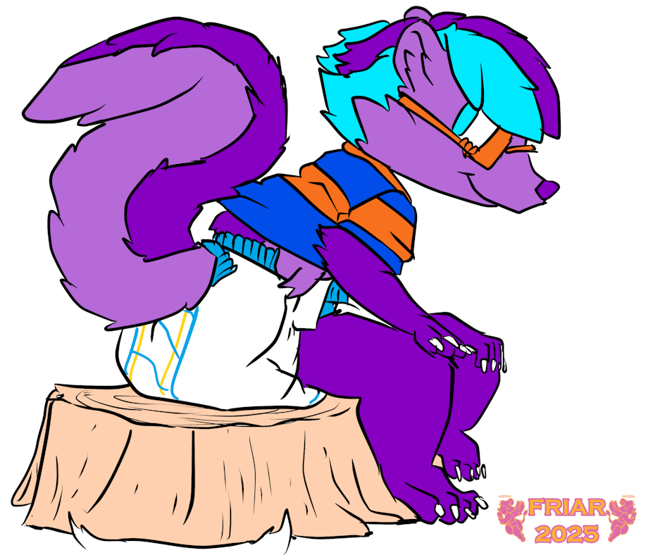 Illustration of Everett the wet and messy diapered skunk seated on a tree stump in front of tree home in a forest with a lantern lighting up the area.