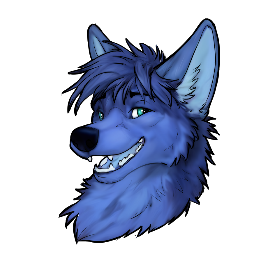 Headshot of Aura a blue wolfmodo looking quite happy to see you.