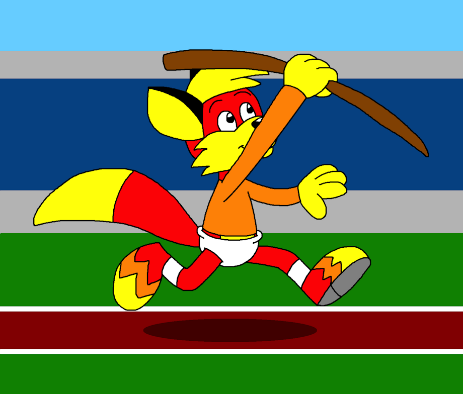 Blaze the Fox Holding a Pole Stick and Started to Approach Run, and He Planting Down to Here and Take Off, Swinging and Jump Up in the Sky, and He Landing Down on the Mat.