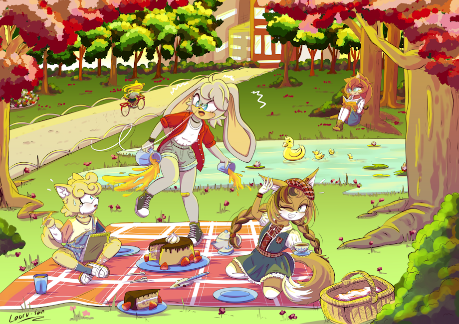 Looru reading just minding her own business lol X3 While the other characters, I love how they're having a bit of a messy situation!~ They're also quite cute too I'd love to see more often!~ ;3 the background is VERY Beautiful, even better than how I draw :3 But I will admit, your cakes on this pic looks delicious! ^^
