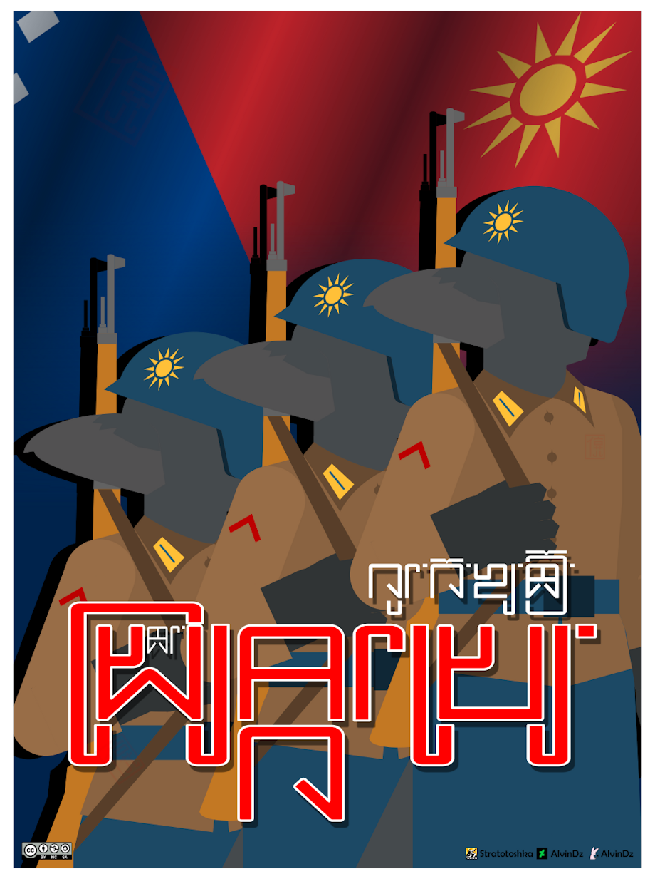 Powkhastaji propaganda posters that encourage young crovens to join the Powkhastaji military, the text from right top to bottom reads "Kawkogiyok yasrivkanin", which literaly means "Let the prophecy comes true!". The "prophecy" refers to the prophecy of where the croven people return to their home land of origin and topple the monarchic family for exile their ancestors in the ancient times and stole their wings.