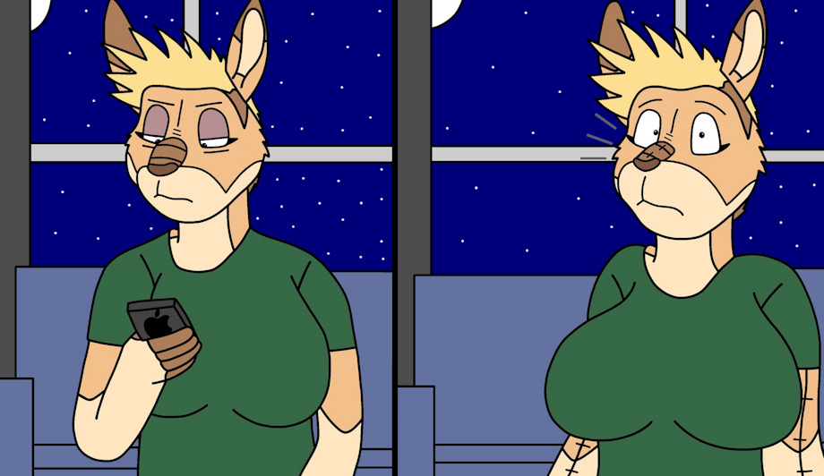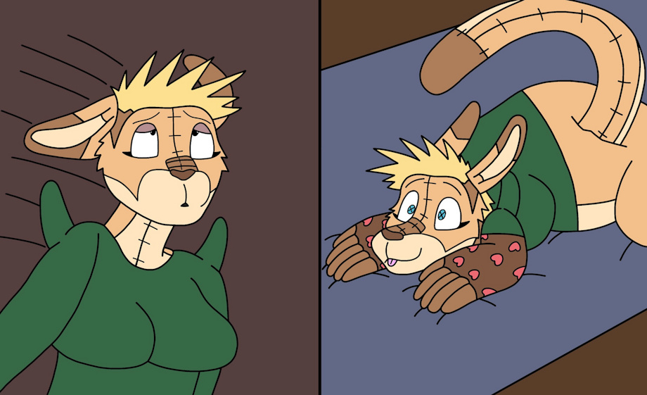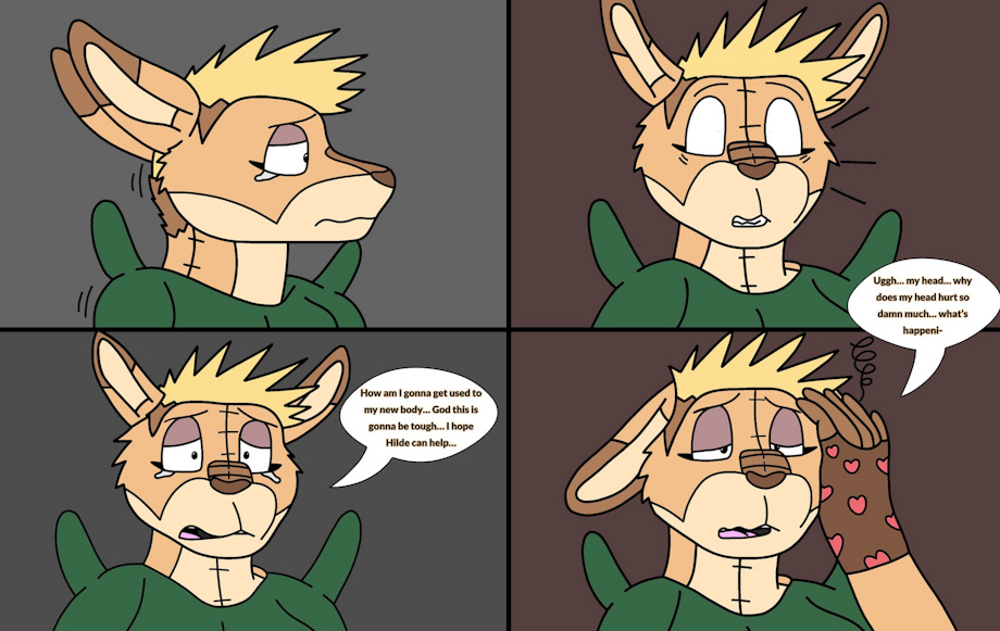 Part 6: (This part is supposed to be read as top left, then bottom left, then top right, then bottom right. I messed up with the layout when I drew this haha!) Adrian walks to the bedroom to go lay down and relax as she waits for Hilde to return. Adrian worries about how she is going to deal with this sudden plushie transformation as she is still teary-eyed very stressed. A very weird feeling shoots straight through her body and is then dizzy from the feeling.