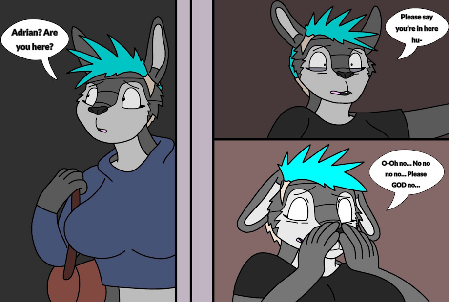 Part 8: Hilde finally arrives home and calls out to Adrian. She puts away her coat in the closet and places her purse down on the table (not shown). She then enters the bedroom where Adrian showed be found but is a bit nervous as the whole apartment is quite. Adrian's son Ali is with at friend's house for a sleepover hence why he isn't in this comic (at least for chapter 1). Hilde them turns on the bedroom lights and sees what she believes is Adrian lying on the bed in her inanimate state.