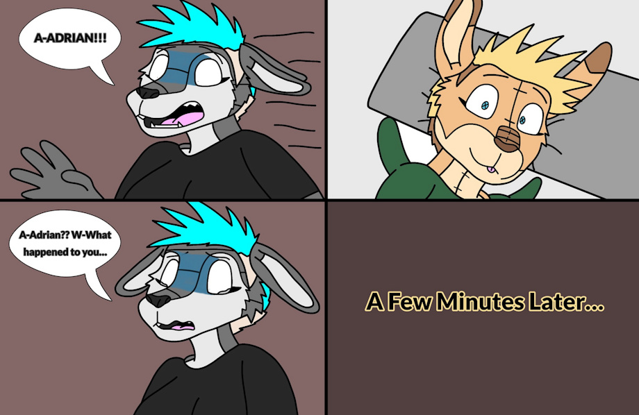 Part 6: (This part is supposed to be read as top left, then bottom left, then top right, then bottom right. I messed up with the layout when I drew this haha!) Adrian walks to the bedroom to go lay down and relax as she waits for Hilde to return. Adrian worries about how she is going to deal with this sudden plushie transformation as she is still teary-eyed very stressed. A very weird feeling shoots straight through her body and is then dizzy from the feeling.