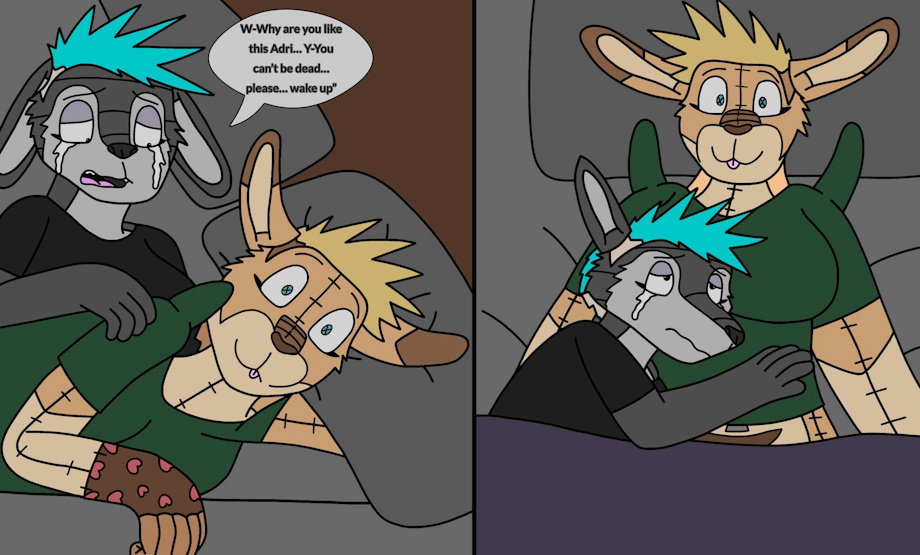 Part 10: Hilde climbs into bed behind Adrian as the wolf is trying to wake her up. She thinks that Adrian is dead but we all know that she isn't. She is just technically unconscious and went inanimate due to how stressed out she was. Hilde then turns the inanimate Adrian plushie onto it's back as Hilde cuddles the kangaroo plushie still teary-eyed due to the predicament she's in as we speak. I hope that Adrian wakes up soon.
