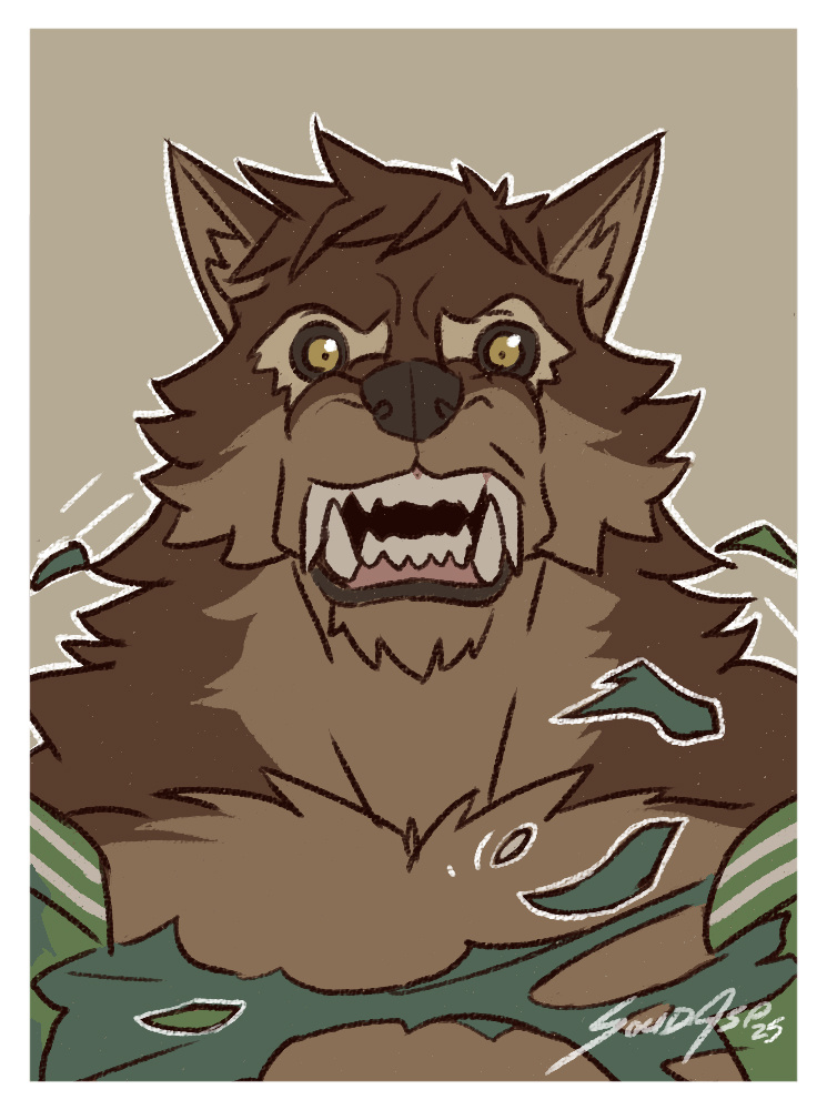 Finally, Pheagle stood up, a whole foot taller than he had been as a human, and growled. He was angry...his expensive outfit lay in tatters on the ground around him, a few scraps clinging to his hulky werewolf body. It didn't matter whose fault it was, Pheagle was gonna get his clothes replaced, and whoever stood in his way was gonna suffer the same fate as him!