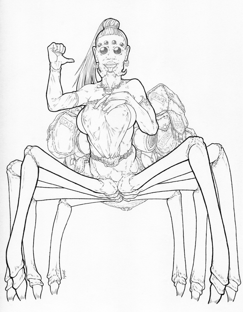 A random fantasy design work to break away from the standard anthro and human lewdities. Her mouth is a pretty tricky thing, combining spider venom fangs and a human jaw (definetly will use her design in a future CML image).