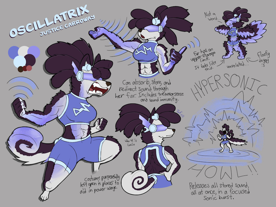 In this setting, powers started appearing a year prior, and the world is still reeling. Wizards, robots, genetic experiments, ancient bloodlines of gods, all of it is coming together to create a soup of crazy no one was prepared for and know one knows what to do about. That brings us to Oscillatrix. Based in the coastal town of Hexa Plaza, Justice was a simple audio engineer hoping to do more for her town, which hadn't produced its own hero yet. After a freak lightning storm that gifted her with the ability to absorb and blast sound, she vowed to step up and protect her community from the sparks that wanted to take it for themselves.