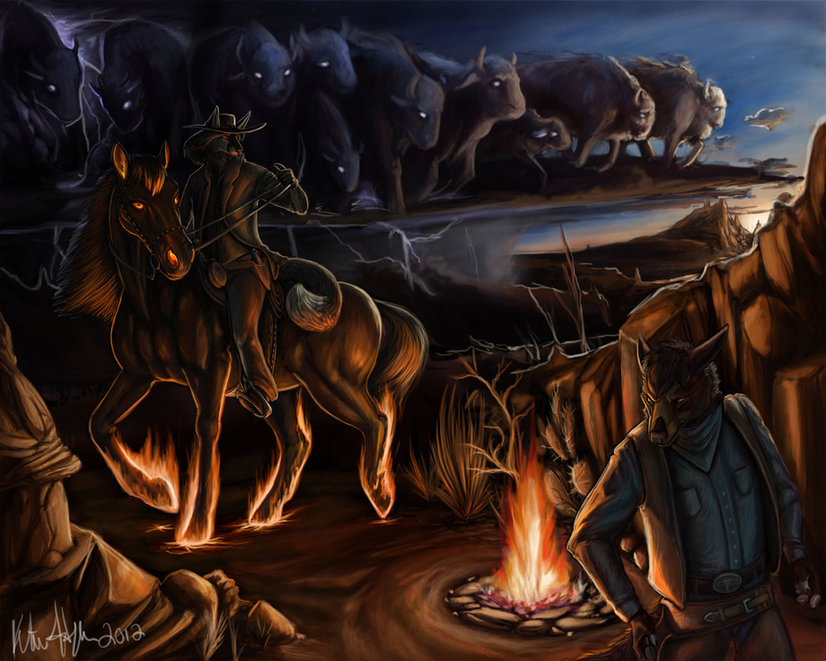 "As the riders loped on by him he heard one call his name If you want to save your soul from Hell a-riding on our range Then cowboy change your ways today or with us you will ride Trying to catch the Devil's herd, across these endless skies "