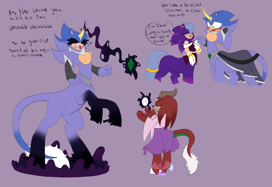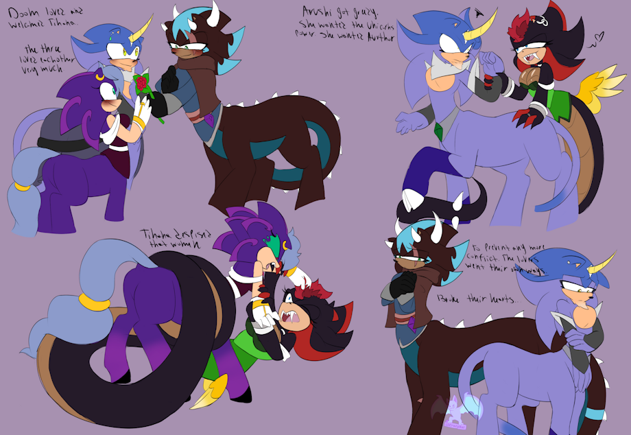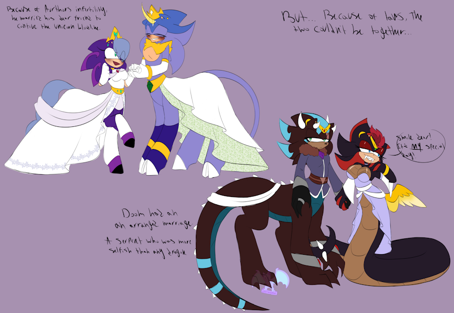 Before Sonic. before Shadow and Mephiles. Before everything, there were them.. A curious Unicorn who met a shy Dragon. They meet unexpectedly. The two kingdoms hated each other, but these two became obsessed with the other. Meeting by the old pond to tell tales and fall in love. The horses knew of their company and trusted the flightless dragon. They knew Aurthor loved him. But rules were rules. The Elders told him, "For now follow the laws. But when you are king. You may follow your heart. Excited, they waited. Years go by, and the Unicorn prince is stronger. Too strong to manage. He's too violent. Scary. So he made a tough decision. Giving up all his magic for a life of peace. He met a lovely lady who too enjoyed his interests. They became friends. Doom loved her company. But because of separate rules the two princes married others. Aurthor married Tihana mostly because he couldn't produce a child. Plus they loved each other. Doom was forced to marry the devil herself. A woman who always took advantage. He hated her. He wanted her gone but without an heir he was forced to be around her. For years Aurshi would destroy any eggs she had. Making sure to stay in power. Eventually, Doom caught on and took the last egg she had and ran. Finding sancuary witht he horses. He was welcomed with open arms and saden to see his lover age. Author reassured him he wasn't that old. Without his magic he ages a bit faster than normal. But he's still as spry as a filly. Chaos they missed having eachother. It was peaceful. Soon that last egg managed to hatch. And to everyones surprise there were twins! They looked so much like their parents. Too much.. Doom did not like the red dragon. Wanted it dead. But Aurthor promised he wouldn't be a problem. They were named Mephiles and Shadow. Little gremilns they were. Always attacking people and fighting. It got to the point Tihana made special inhibiter cuffs to calm them down. Six years pass and Doom has forgotten his duties for the Dragons. Finding Arushi had tracked him down. She was surprised to find the kids. Admiring the red dragons resemling herself. She wanted them dead. She wanted to take their souls. Aurthor kicked her out and threathen death if she returned. Which she didn't take so well and in return killed his friends. Targeting the unicorns of the village. All died but the king. Who distracted the serpent long enough for everyone to leave. Tihana didn't want to leave her friend but had no choice. Those two were never found. Everyone assumed they killed each other. Doom regretted letting that women live for so long. He lost just as much. All he had left were the kids his lover named and his dearest friend. They both promised to protect everyone and start a new life. Tihana didn't get to surprise Aurthor that they were having a child. Doom suggested a bond. And she agreed. To combine both kingdoms to further strengthen every soul. To have the unborn child wed the strongest twin. Mephiles. So they can finally end the war between unicorns and dragons...