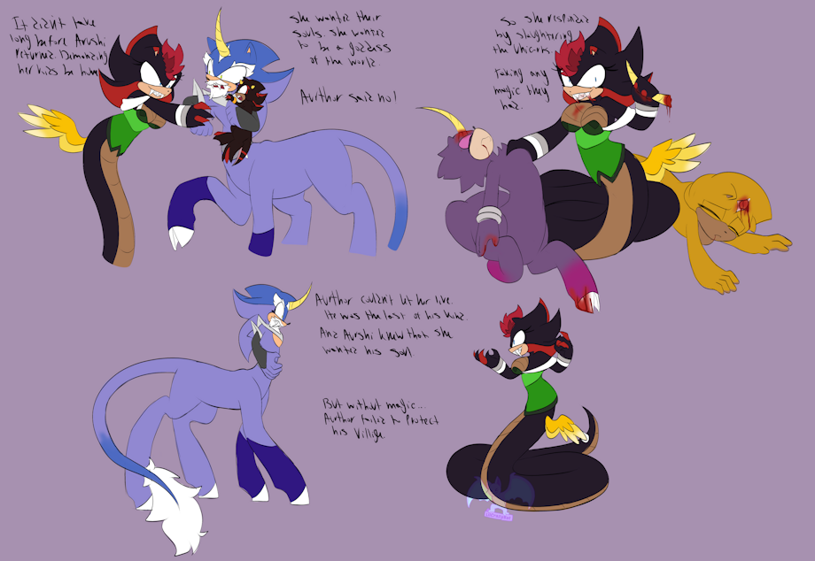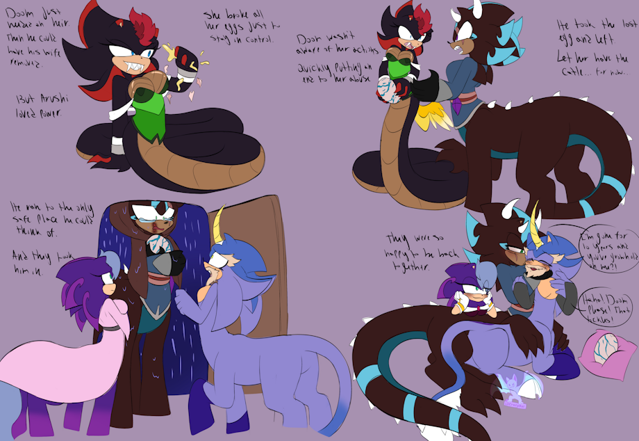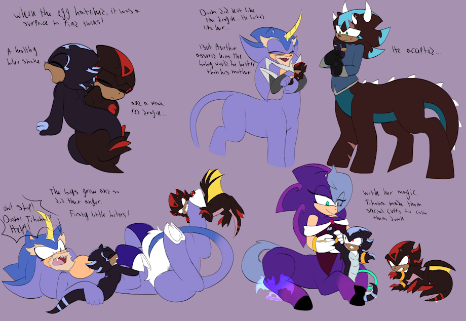 Before Sonic. before Shadow and Mephiles. Before everything, there were them.. A curious Unicorn who met a shy Dragon. They meet unexpectedly. The two kingdoms hated each other, but these two became obsessed with the other. Meeting by the old pond to tell tales and fall in love. The horses knew of their company and trusted the flightless dragon. They knew Aurthor loved him. But rules were rules. The Elders told him, "For now follow the laws. But when you are king. You may follow your heart. Excited, they waited. Years go by, and the Unicorn prince is stronger. Too strong to manage. He's too violent. Scary. So he made a tough decision. Giving up all his magic for a life of peace. He met a lovely lady who too enjoyed his interests. They became friends. Doom loved her company. But because of separate rules the two princes married others. Aurthor married Tihana mostly because he couldn't produce a child. Plus they loved each other. Doom was forced to marry the devil herself. A woman who always took advantage. He hated her. He wanted her gone but without an heir he was forced to be around her. For years Aurshi would destroy any eggs she had. Making sure to stay in power. Eventually, Doom caught on and took the last egg she had and ran. Finding sancuary witht he horses. He was welcomed with open arms and saden to see his lover age. Author reassured him he wasn't that old. Without his magic he ages a bit faster than normal. But he's still as spry as a filly. Chaos they missed having eachother. It was peaceful. Soon that last egg managed to hatch. And to everyones surprise there were twins! They looked so much like their parents. Too much.. Doom did not like the red dragon. Wanted it dead. But Aurthor promised he wouldn't be a problem. They were named Mephiles and Shadow. Little gremilns they were. Always attacking people and fighting. It got to the point Tihana made special inhibiter cuffs to calm them down. Six years pass and Doom has forgotten his duties for the Dragons. Finding Arushi had tracked him down. She was surprised to find the kids. Admiring the red dragons resemling herself. She wanted them dead. She wanted to take their souls. Aurthor kicked her out and threathen death if she returned. Which she didn't take so well and in return killed his friends. Targeting the unicorns of the village. All died but the king. Who distracted the serpent long enough for everyone to leave. Tihana didn't want to leave her friend but had no choice. Those two were never found. Everyone assumed they killed each other. Doom regretted letting that women live for so long. He lost just as much. All he had left were the kids his lover named and his dearest friend. They both promised to protect everyone and start a new life. Tihana didn't get to surprise Aurthor that they were having a child. Doom suggested a bond. And she agreed. To combine both kingdoms to further strengthen every soul. To have the unborn child wed the strongest twin. Mephiles. So they can finally end the war between unicorns and dragons...