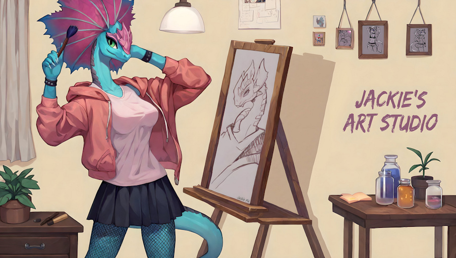 Introducing my lovely OC and fursona, Jackie the lizard, who likes to draw and is quite a good writer who loves to come up with fantastic stories, incredible adventures and romantic tales. She is a very kind, modest, but at the same time confident girl and never gives up on anything halfway and always goes all the way.