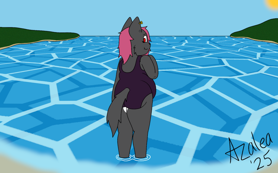 Another commission from the same anonymous commissioner who wanted me to draw my fursona, but with my more accurate body proportions in real life. So, here I am, feet in the water as I look back at the camera and smiling. I very much enjoy the beach, but rarely if ever get to swim because of body dysphoria and dysmorphia that make me not wanna swim or even attempt to try a swimsuit. But lately, I wanna try swimming more and get a swimsuit, thanks to a certain someone making me feel more comfortable in my body.