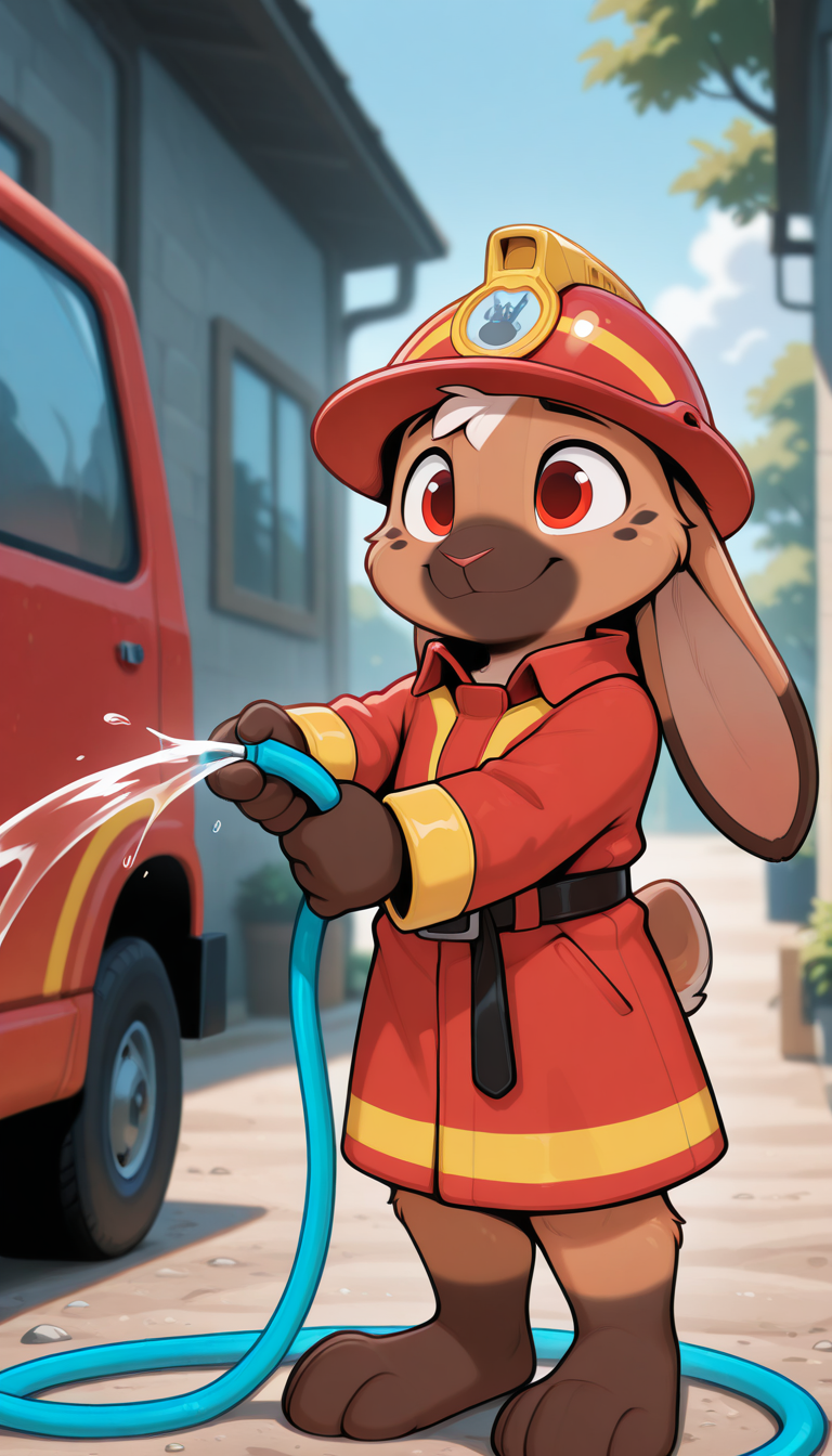 I based this picture on how they taught us fire safety in school when I was a little kid. They let us wear the really heavy coat and firemen hat then had us spray water on a small controlled fire. image generated using A1111 webui Model used is at the bottom of the text file. Lora used is my own lora found in this journal: https://inkbunny.net/j/556051-Minibit-minibit-lora-3