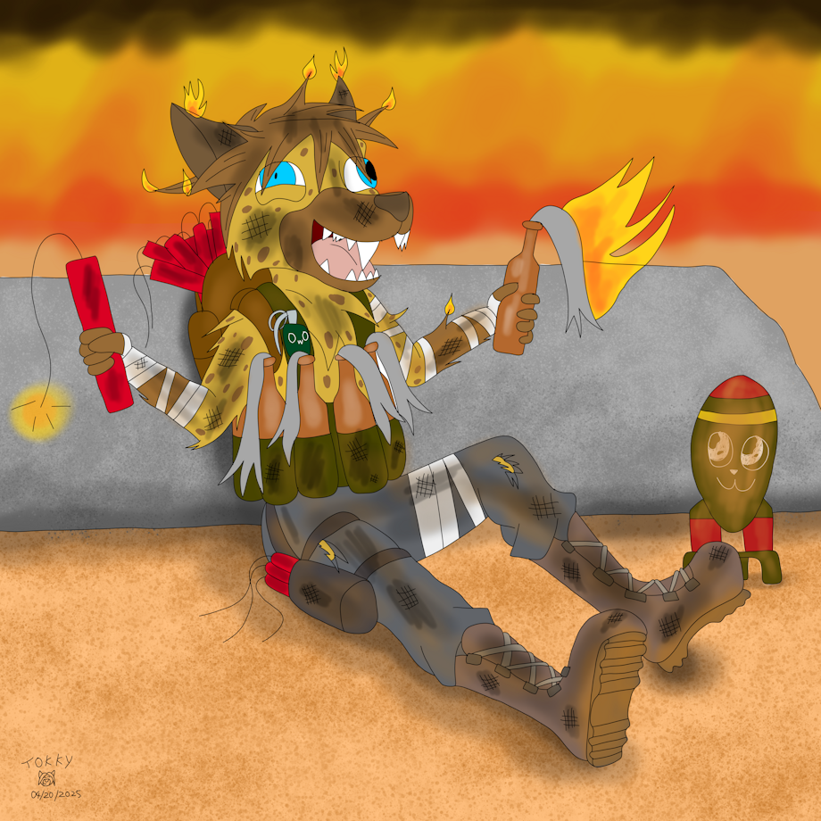 Molly has travelled the wasteland, leaving a trail of smouldering destruction behind her; sometimes offering her...."expertise" to any individuals, factions or small time gangs that "need to make a BIIIG boom!" as she puts it; she doesn't care what you need burning or blowing up, just as long as she gets to "enjoy the pretty flames". Though thanks to her small intellect, reckless approach to safety, and obsession with "going big or going home!" her employers often end up getting a lot more "bang for their buck" than they can handle. Molly always massively overcompensates how big of a bang is needed for the present situation, favoring spectacle over practicality, an attitude which often leads her to accidentally blowing up her benefactors, but hey, at least she gets to enjoy the pretty flames π. Molly often smells like singed yeen fur.