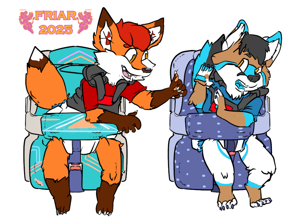 Illustrated commission of Blade Darnay the diapered fox and Fenris the diapered folf who are both seated in car seats in the back of a car. Blade is gesturing as if he is about to poke Fenris, and Fenris is reacting as if he's been poked. A game boy and diaper bag are in the backseat, and the car seats have 90s prints.