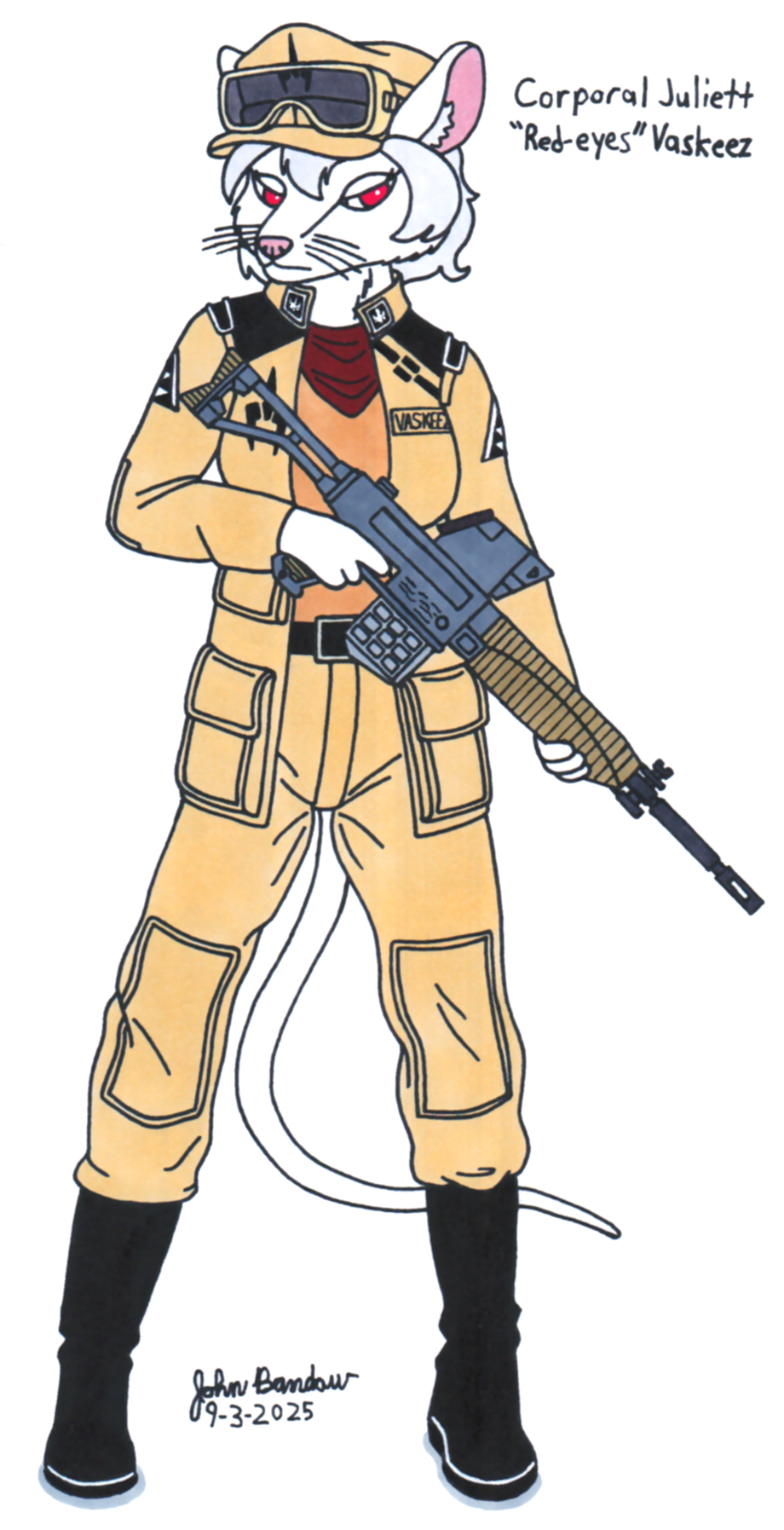 Another rare cross-universe pic: this time, a rendition of what my marks-mouse and walking Aliens reference Vasqueez would look like in the Empires universe. Done by MarcusStarkiller on FA. Hey; we learn what her full name is in a less fantasy, more scifi setting.