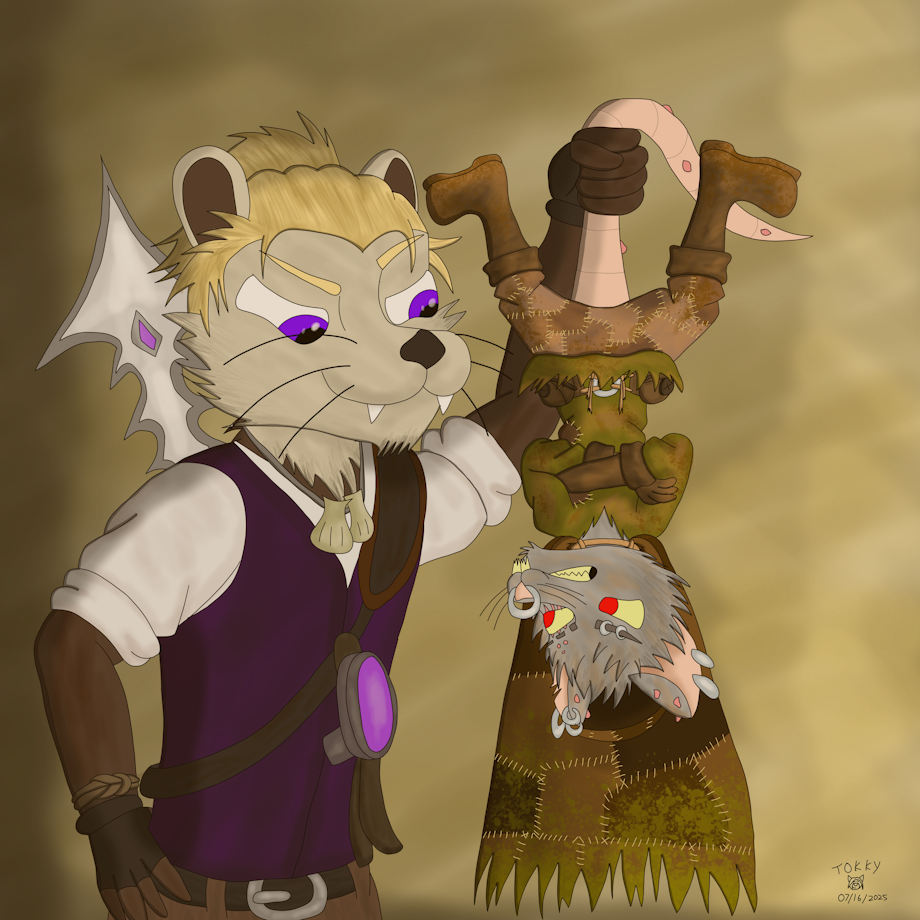 Gutternoze fired an eldrich blast at Lorengales feet to get his attention. The dragonborn looked up at the small, hooded rat and smirked, he then immediately grabbed the waistband of the raccoons underwear and in one swift motion yanked his tightywhities up and over his head and hooked the waistband under the raccoons chin, before shoving the villager to one side in a groaning mess and walking towards the scruffily dressed rat.