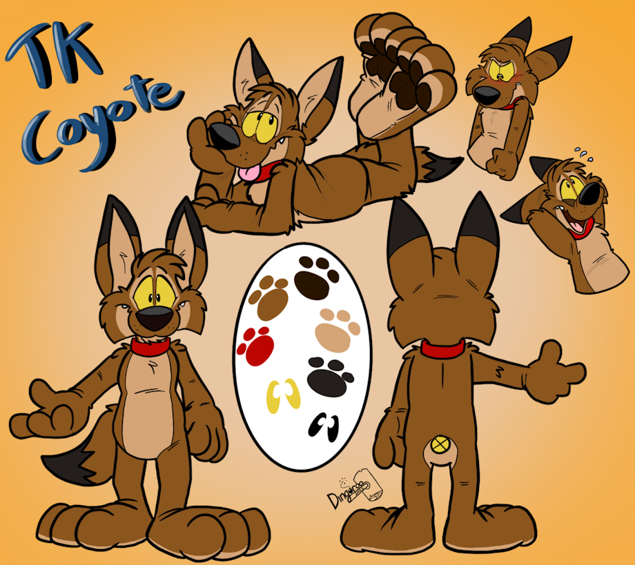Brown and Tan Coyote. Yellow eyes. Black-tipped ears and tail. Red collar. 3 or 4 toes depending on art style. Age varies depending on art style - Sometimes Puppy, Cub, Adolescent, Feral, Adult, Dad, etc... it just depends on what the art is going to be!