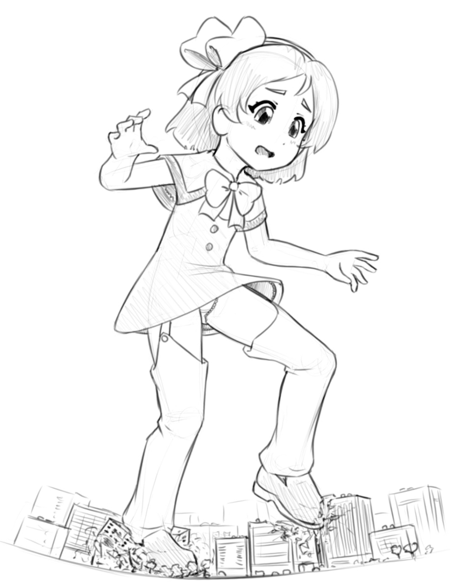 It's so crazy that this character, who only appears in one movie, has gotten so popular. I think you've drawn her 3 times now? I'd have to check. But it is nice seeing her get brought up again. I like her pose, trying to balance, as well as her facial expression. And she is a really nice size for crushing buildings underfoot like that too. Really nice work!