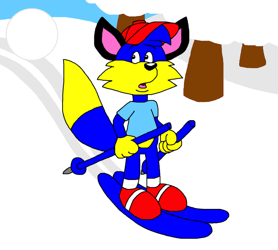 Alex the Fox Behind a Snowball and Skiing Down the Snow Hill