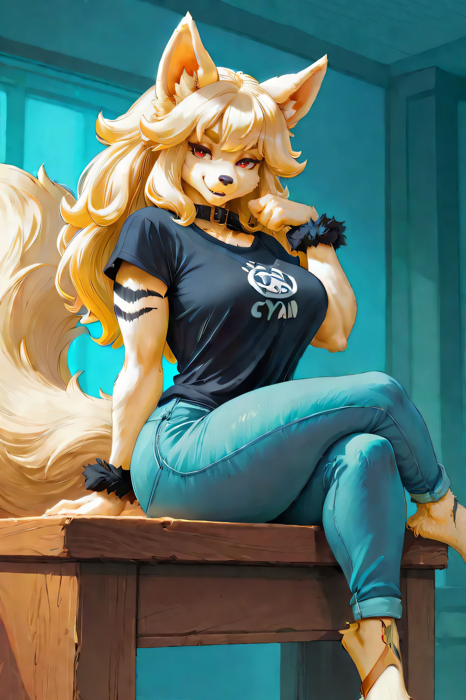 masterpiece, high quality, detailed fur, high detail, 4k, detailed background <lora:(1) FenrisXL Lighting:1> <lora:(1) Mjölnir (SDXL Lighting):1> <lora:photorealistic anthro 2:1> furry fface detailxl (posing, smiling, sitting on desk, solo, legs crossed, full body:1.4) (cyan tshirt, jeans:1.4) <z44z4> (voluptuous:female:anthro:komainu1.3) (arcanine:0.7) (white fur:1.6) (large breasts:1.2) (medium length blond hair:1.3) (striped body, black stripes:1.3) (cyan collar:1.5) (red eyes with black pupils:1.2) (thick thighs:1) (blonde wrist tuft, blonde ankle tuft:1.2) (digitigrade:1) (dog ears, dog tail, doggirl:1) Negative prompt: NEGATIVE_HANDS ac_neg2 p0rnXL-neg DeepNegative_xl_v1 BeyondV3-neg Steps: 15, Sampler: DDIM, Schedule type: SGM Uniform, CFG scale: 3, Seed: 3177714519, Size: 512x768, Model hash: 171e88f0da, Model: yiffymix_v62Noobxl, Denoising strength: 0.1, ADetailer model: person_yolov8s-seg.pt, ADetailer confidence: 0.3, ADetailer dilate erode: 4, ADetailer mask blur: 4, ADetailer denoising strength: 0.4, ADetailer inpaint only masked: True, ADetailer inpaint padding: 32, ADetailer model 2nd: face_yolov8s.pt, ADetailer confidence 2nd: 0.3, ADetailer dilate erode 2nd: 4, ADetailer mask blur 2nd: 4, ADetailer denoising strength 2nd: 0.4, ADetailer inpaint only masked 2nd: True, ADetailer inpaint padding 2nd: 32, ADetailer model 3rd: hand_yolov8n.pt, ADetailer confidence 3rd: 0.3, ADetailer dilate erode 3rd: 4, ADetailer mask blur 3rd: 4, ADetailer denoising strength 3rd: 0.3, ADetailer inpaint only masked 3rd: True, ADetailer inpaint padding 3rd: 32, ADetailer model 4th: mediapipe_face_mesh_eyes_only, ADetailer confidence 4th: 0.3, ADetailer dilate erode 4th: 4, ADetailer mask blur 4th: 4, ADetailer denoising strength 4th: 0.4, ADetailer inpaint only masked 4th: True, ADetailer inpaint padding 4th: 32, ADetailer version: 25.3.0, Hires upscale: 1.5, Hires steps: 20, Hires upscaler: 4xUltrasharp_4xUltrasharpV10.pth, Lora hashes: "(1) FenrisXL Lighting: c49df8024095, (1) Mjölnir (SDXL Lighting): 368d428918ac, photorealistic anthro 2: bed53d4c8b68", TI: "detailxl, detailxl", Version: f2.0.1v1.10.1-previous-224-g90019688 |