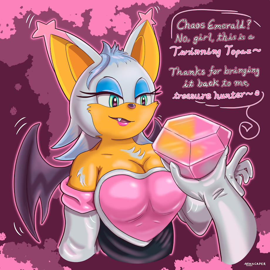ALT Description Text (Re-posted): bust comic portrait of an anthropomorphic furry cat, Mewey, almost completely transformed, specifically twinned, into the character Rouge the Bat from the *Sonic* series.