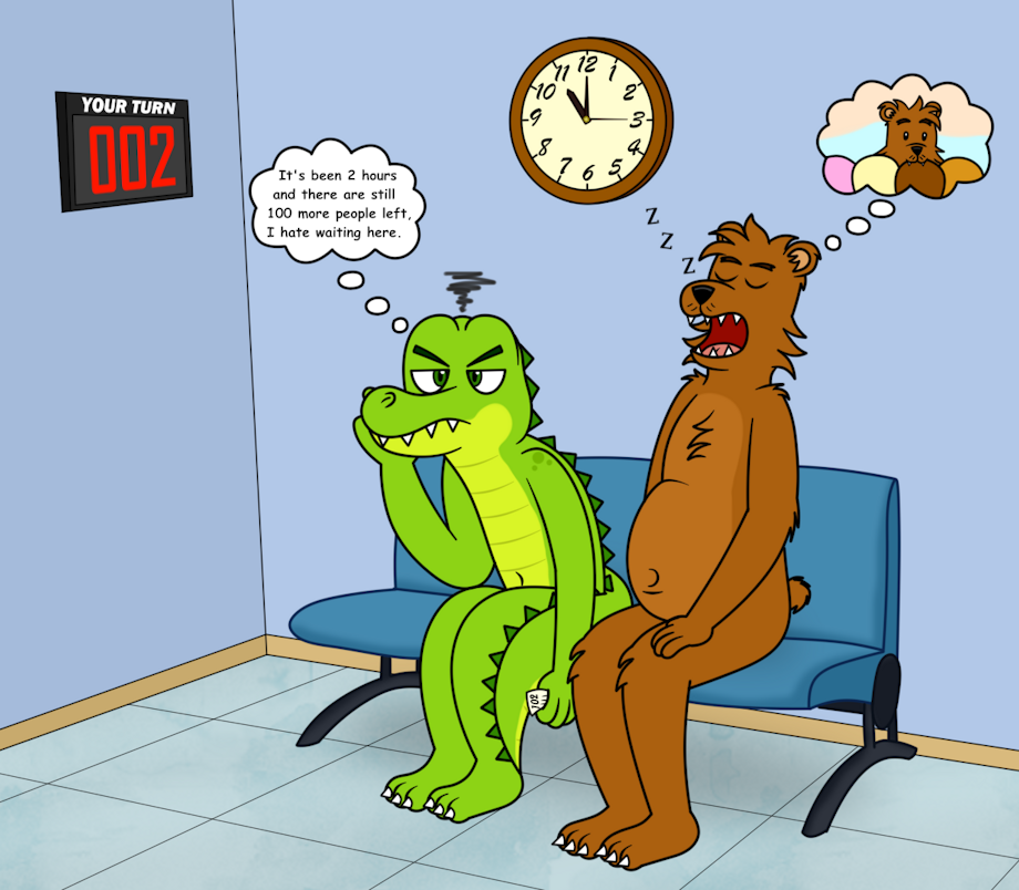 Croc and Bert are sitting waiting for their turn to be called, however the wait has been very long, Croc is in a bad mood because of the long wait, meanwhile Bert fell asleep and is dreaming that he is eating ice cream.