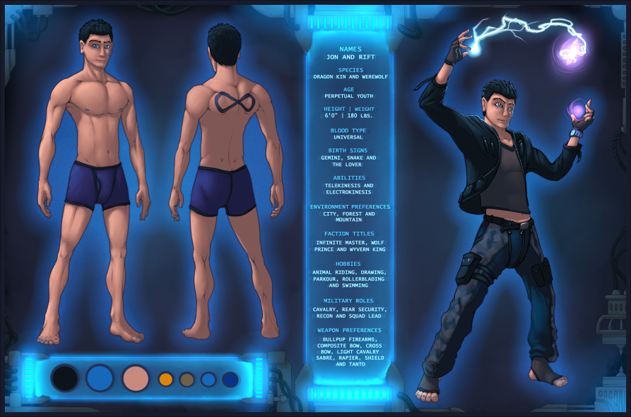 A reference sheet for Wolfywetfurr of his character, Rift, with lots of fun fun glowing