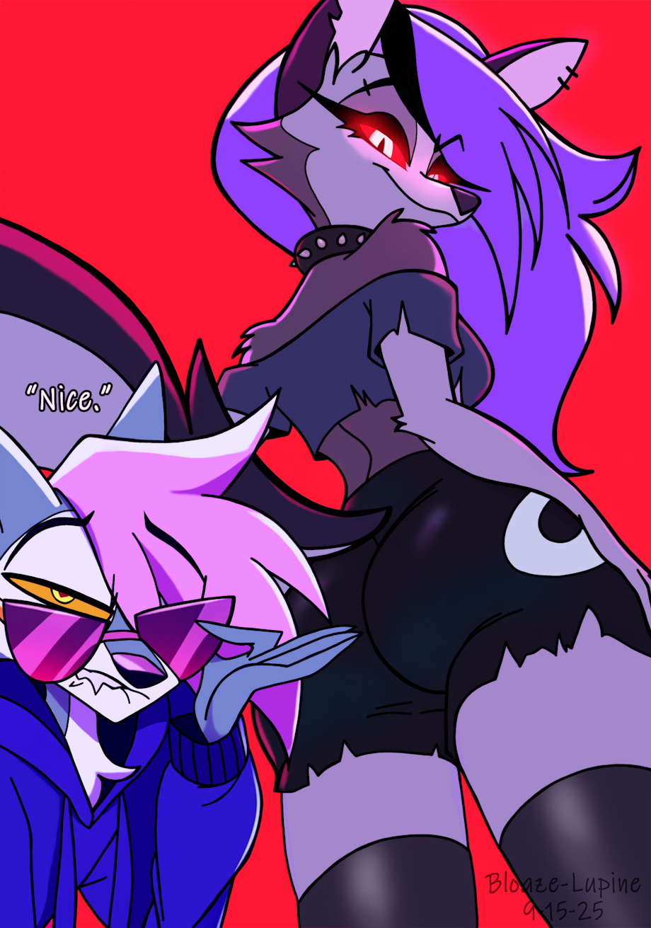 Blaze and Loona sat side by side on their apartment rooftop in hell, a bottle of half-drunk whiskey between them and the gentle hiss of a shared cigarette trailing lazy smoke into the sky. The glow of Imp City shimmered below like molten glass - orange and sickly and kind of beautiful when you were too damn tired to care.