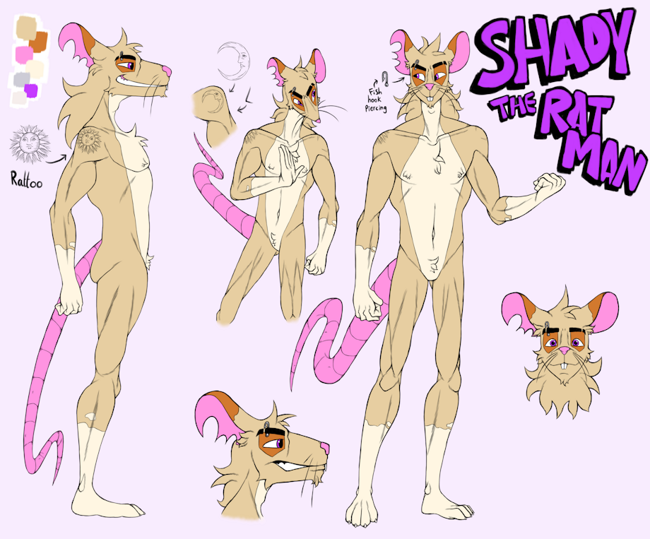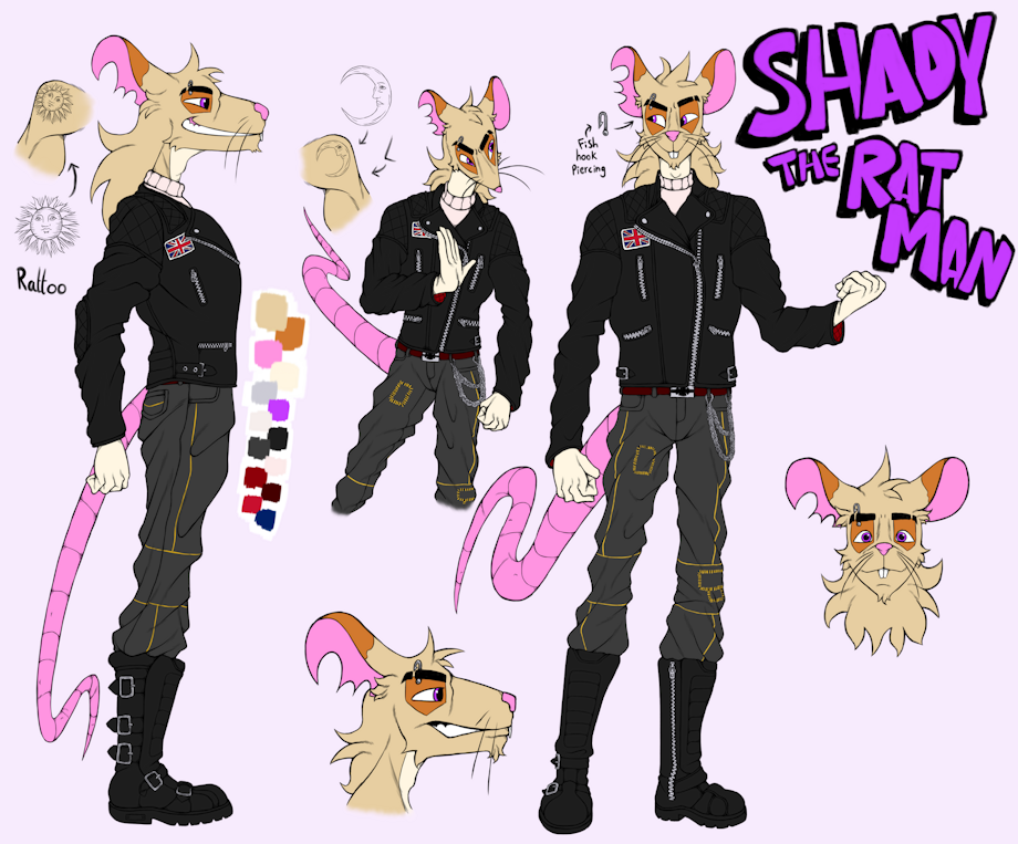 A reference sheet for my sona Shady! look at him in all his lil RatMan glory!