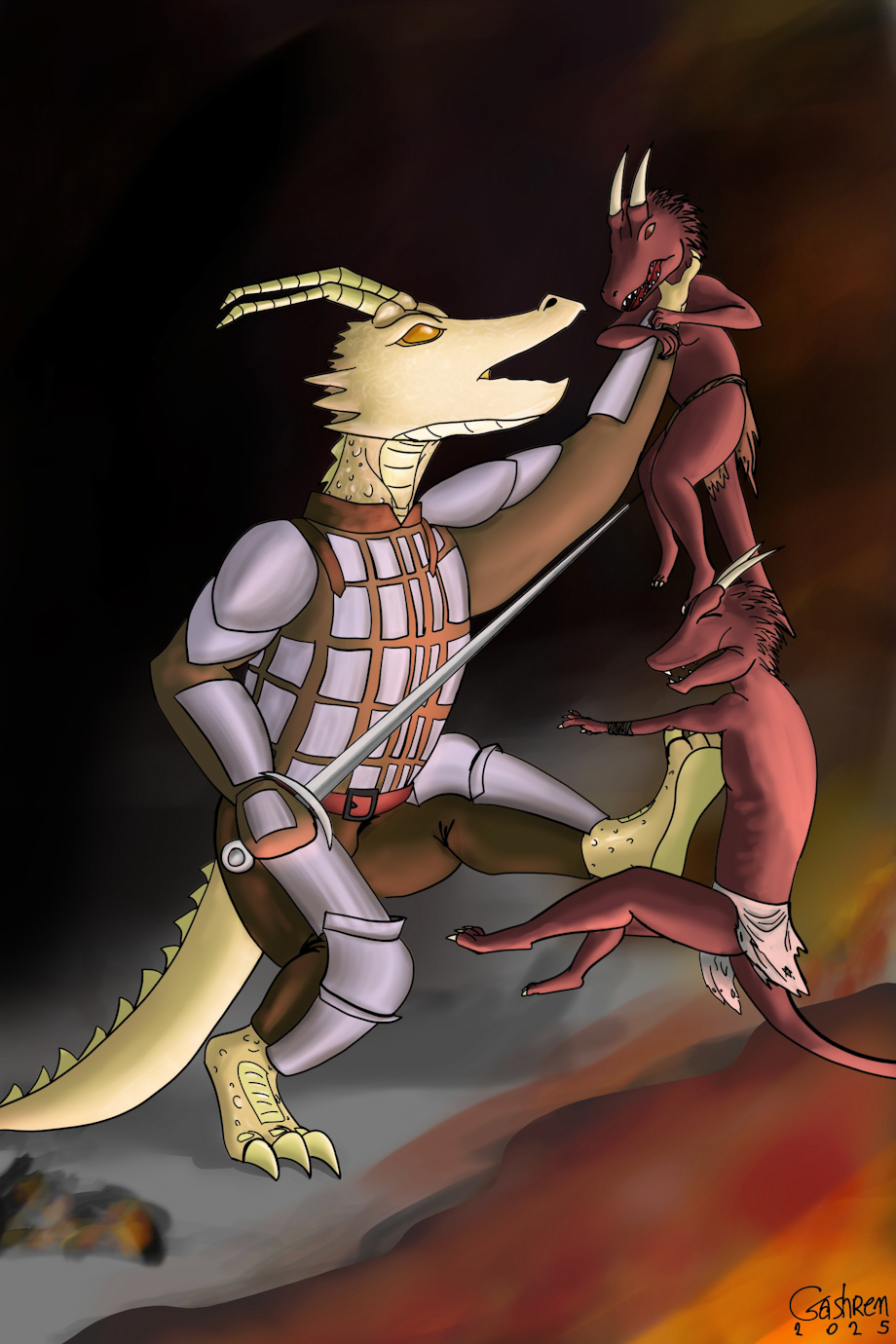 Phew! That took a lot to finish. Well, I'm the one to blame - nine sketches including one with three characters despite commissioner paid just for one, but I thought the idea was neat, so I included the sketch with kobold fight too, and they chosen it. Then standard process - lines, colros, shading, lighting, background (technically I should include background in lines stage, so it wouldn't look as stylistically different from the characters). Didn't have the timer open, but it took something about 9-10hours, I think?