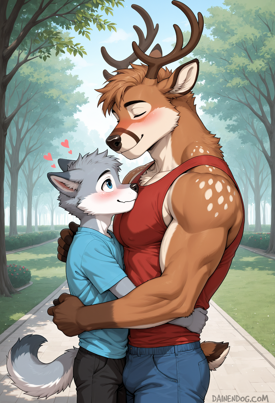 Sometimes I think life changes too fast. One day you’re running around the neighborhood, climbing trees, pretending to be a superhero, laughing at the smallest things, and the next… suddenly there’s this strange feeling that makes everything brighter and scarier at the same time. I never thought I’d be the kind of boy to sit down and write about feelings, but oh my gosh, here I am, scribbling in this notebook, trying to make sense of the way my chest feels like it’s going to burst every time I see him. Because today, just like all the other days, I met him again—and it was everything. He’s a deer, older than me, and stronger too, and every time he stands next to me, I feel like I could disappear inside his shadow. His shoulders are broad, his arms powerful, and his brown fur catches the light like it was made for golden hours. And his eyes—oh, his eyes are the same blue as mine. Sometimes I catch myself staring at them for too long, as if they were mirrors, and I wonder if he ever notices. Probably not. He’s too busy being himself: calm, gentle, with that way of smiling like nothing in the world could really break him. When he hugs me, it’s like the whole sky folds away and there’s only us left in the universe. We met at the park today, like always. To him, it was nothing more than another hangout, a chance to talk, to laugh, and to just spend time together. But to me? It felt like the world had been waiting for this moment all week. The second I saw him walking toward me, my knees almost gave out. I had to bite my lip to stop myself from grinning too wide. What kind of wolf gets nervous like this? I asked myself, but the answer was obvious: the kind who’s hopelessly in love. He opened his arms, easy as always, and pulled me close. And that’s when time just… stopped. I buried my face against his chest, pretending it was only a hug like any other, but my eyes stayed open because I wanted to memorize every detail. The way his breath slowed. The way the sunlight lit up the curve of his antlers like a crown. The way his heartbeat thudded steady beneath my snout, so strong compared to my own frantic one. And me? Just this small, gray, clumsy wolf, shaking inside, wishing with everything I had that he could somehow hear what I couldn’t say. Because it’s true: I’ve already told him all my secrets. Every silly memory, every embarrassing story, every dream and fear. He knows more about me than anyone else. And somewhere along the way, without me even noticing, love sneaked into my heart. It’s like it climbed in quietly one night, settled there, and now refuses to leave. And what can I do with it? I’m stuck. Because what if being his friend isn’t enough anymore? What if my heart can’t settle for less, even if that’s all he can give? He can say yes, he can say no, but the truth is that just being his friend isn’t enough for me anymore. I want more. I want him to look at me with the same fire I feel when I look at him. I want to be the reason he laughs, the reason he feels safe, and the one he thinks of before falling asleep. I want to walk by his side not just as his buddy but as something more. His boy. His love. The hug lasted longer than usual. I know he noticed. He didn’t say anything, but I could feel it in the way his hands shifted slightly, unsure whether to let go or hold on. He was waiting for me to pull away, but I couldn’t. I didn’t want to. My heart was hammering so loud I thought he might hear it, and for a second I imagined tilting my head up and whispering the truth: love has already entered my heart, so tell me, what do we do now? But the words stayed stuck, like they always do. Instead, I smiled too quickly, pretending nothing happened. Pretending I wasn’t burning alive inside. He smiled back, easy and carefree, not knowing that my entire world had shifted in that single hug. I wished so hard that one day he’d look at me with the same spark, the same secret, and the same impossible hope. So here I am, writing it all down where no one else will ever read. Maybe one day I’ll have the courage to tell him. Maybe one day this won’t be just a secret between me and these pages. Until then, I’ll hold on to this moment: a hug that lasted a little too long, a silence that said more than words, and the truth that I can’t escape anymore. Because, oh my gosh… It's so sad to hide such a beautiful feeling, but what can I do? |