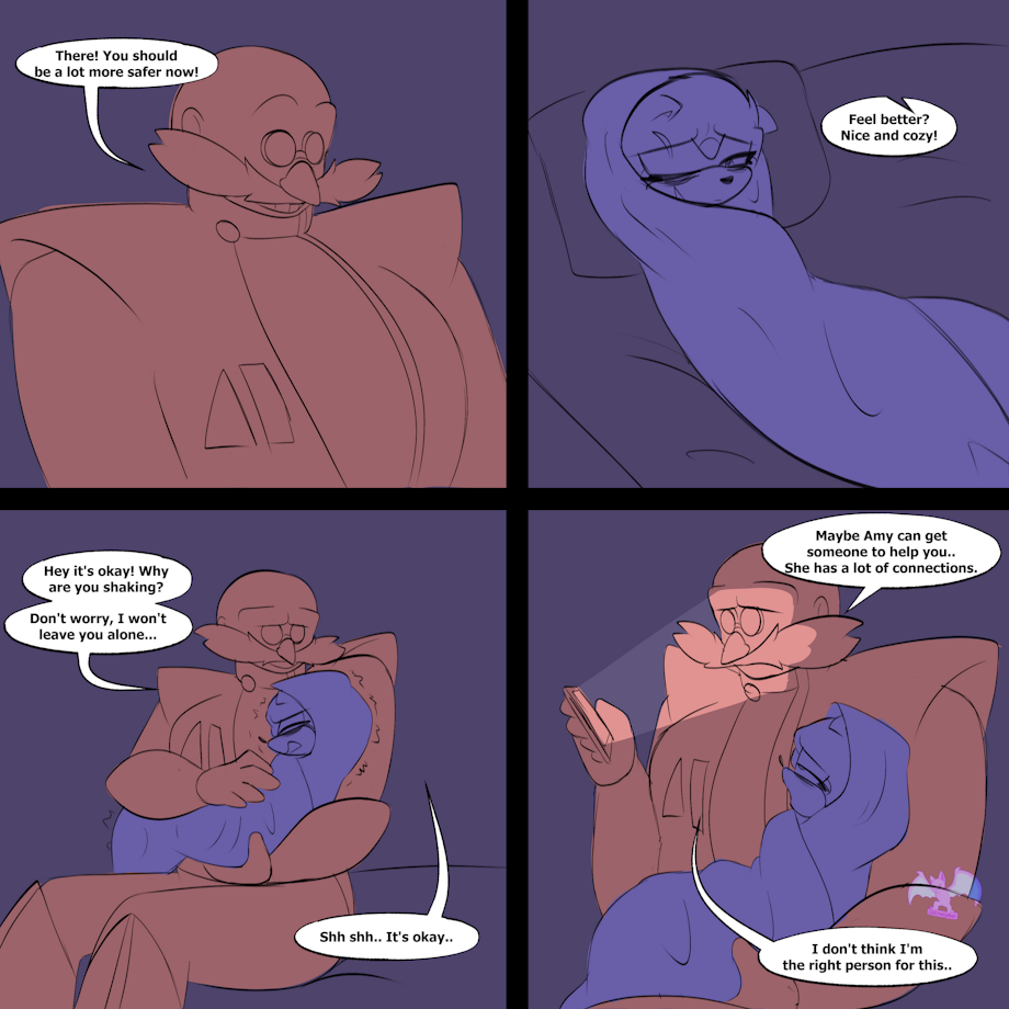 The night of Recovery pt 1, Eggman couldn't decide how to move forward with this sudden event. He had no intentions on keeping this person. He had no time to raise a child. Taking Blue from that nightmare wasn't even a thought. He just did it because it wasn't safe to leave him there. He also wasn't planning on keeping him. But look at him. Look at that broken soul and tell me you would love to see him happy.