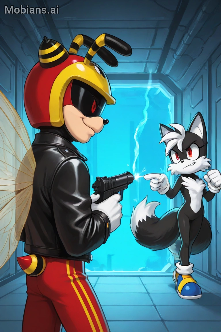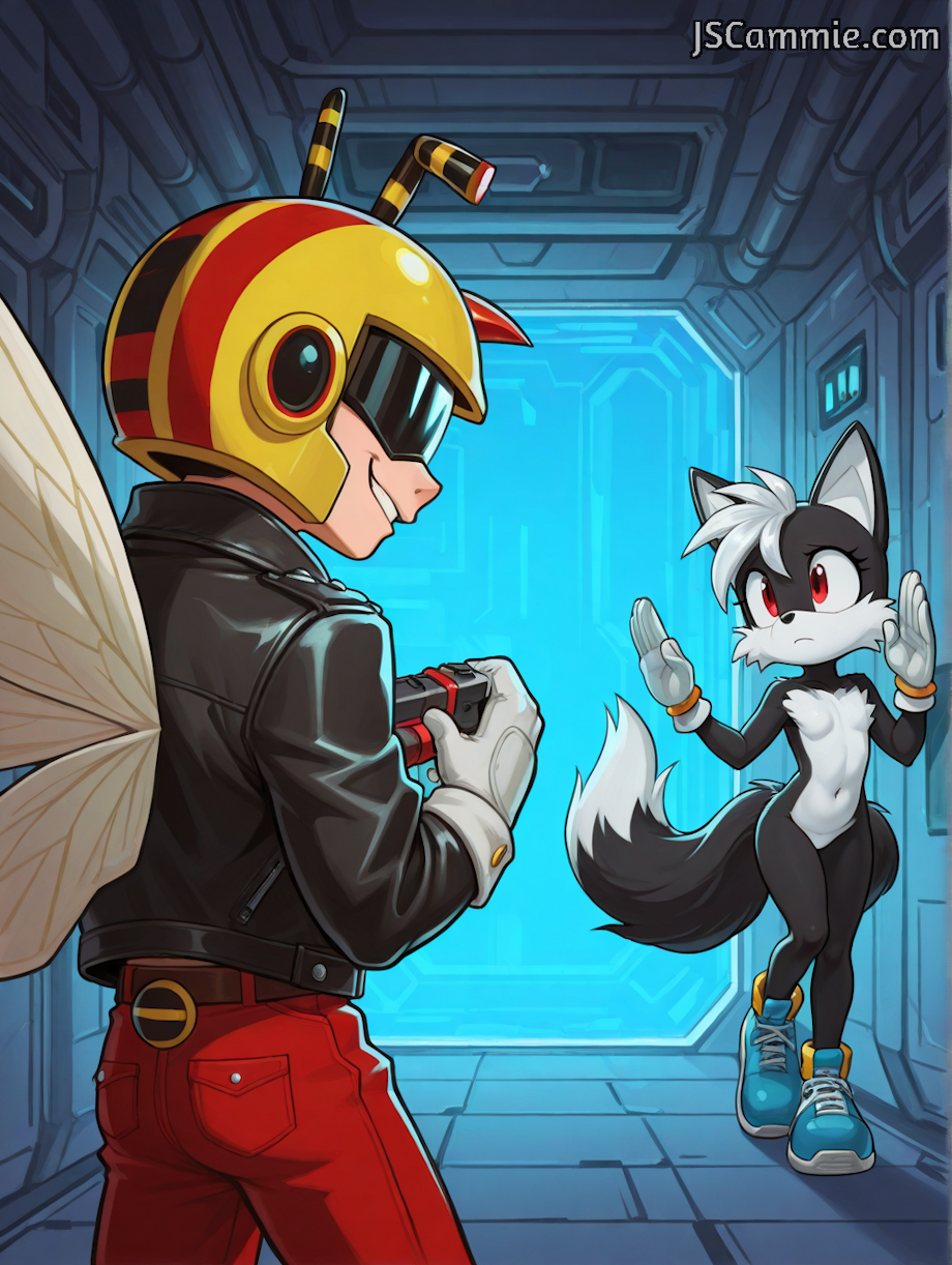 Ch. 32 - Zipp the hornet meets Copter on Space Colony ARK. He pulls a gun on Copter, saying he and Vortex don't need him. Copter hits back with the Chaos Tailband, and Zipp agrees to team up with him in their journey to the Space Prison.