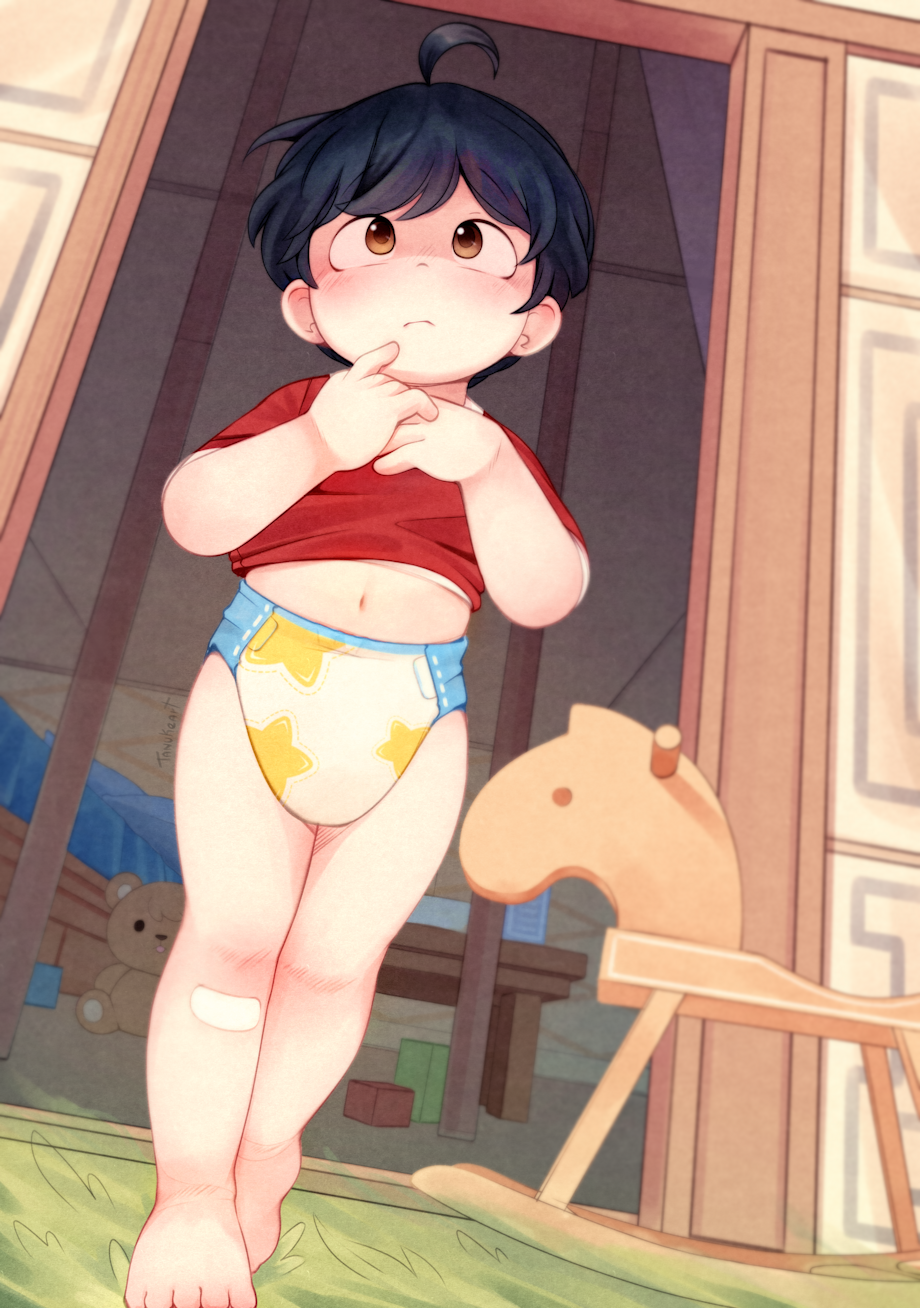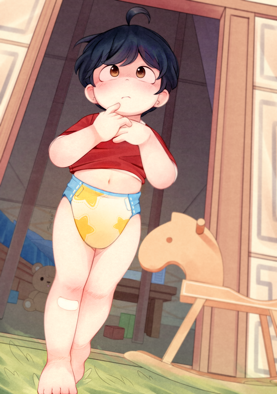 “I… I had an accident,” he confesses softly. “It’s all wet and yucky. Can you change me, pwease?”