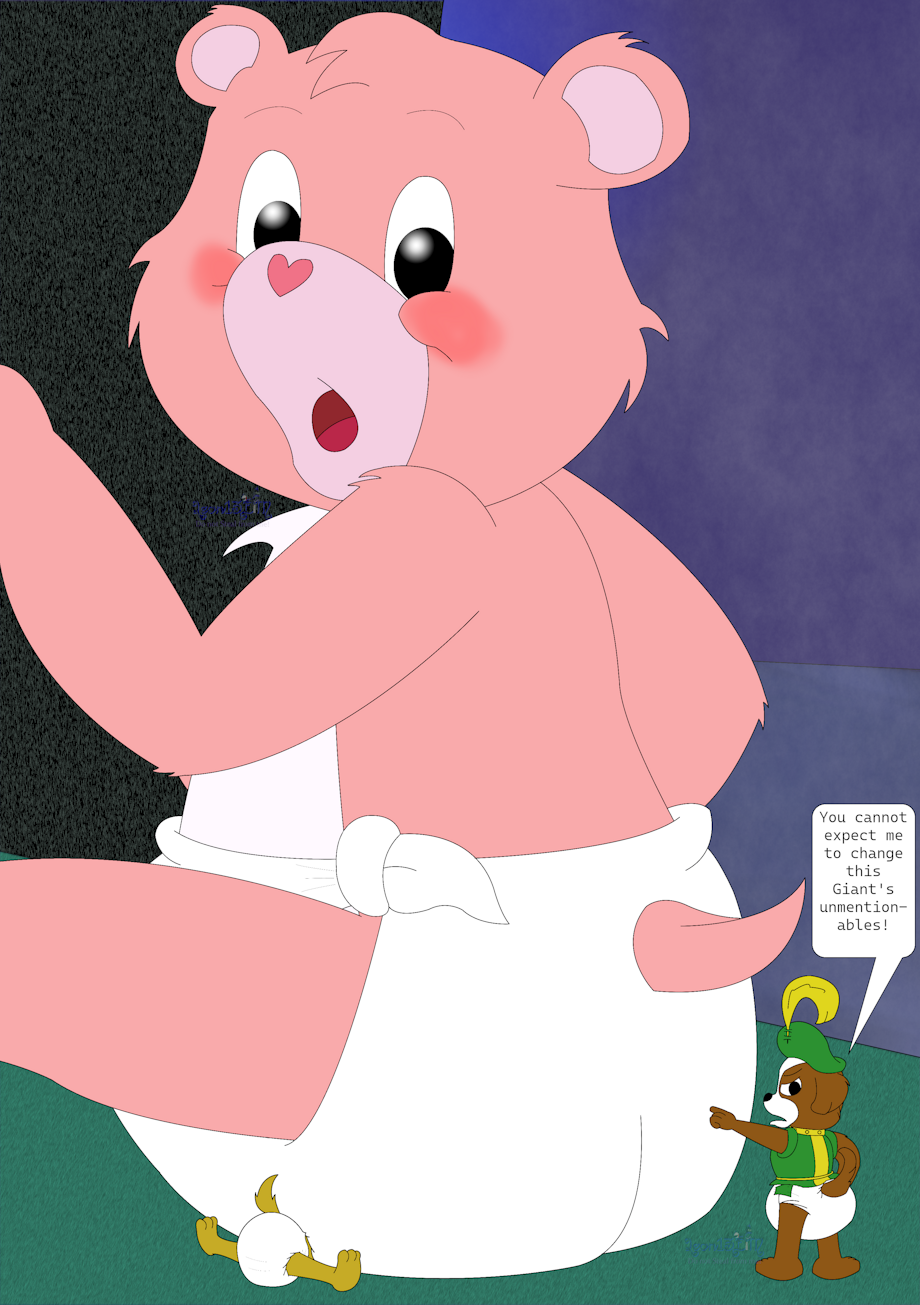 Hugs, the pink baby Care Bear in a cloth diaper held up with knots on the side, is seated on the grass as she looks over her shoulder with her mouth slightly open in surprise while blushing. Sticking out from beneath her diapered rear is the thickly diapered hindquarters of Lady, one of the Biskitts, a small dog with light brown fur and a short tail.