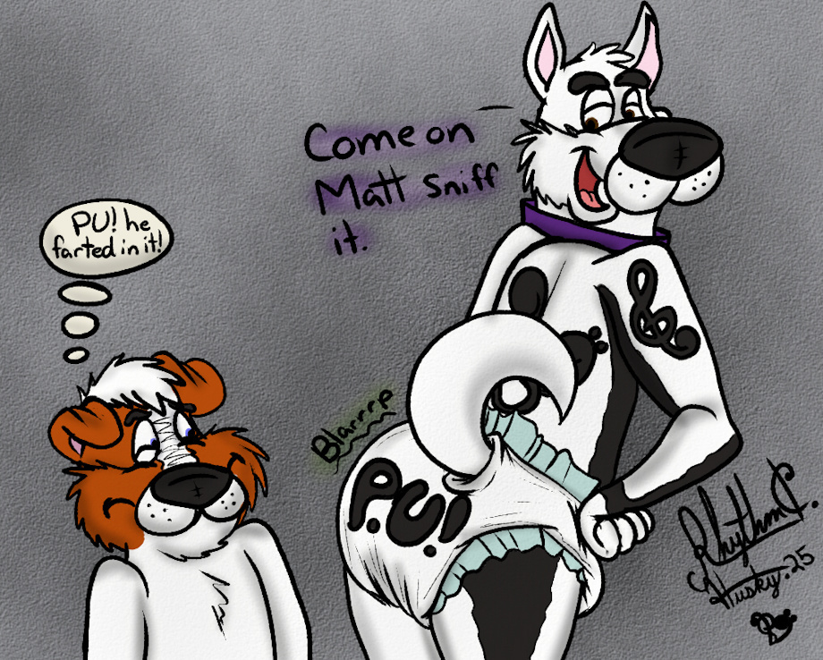 Rhythm C. Husky and matt where spending some time alone in the house all padded up and I was feeling very gassy that afternoot I have been farting in my new air tight diapers that I bought and thought "hmmm I wonder if these are truly air tight?" so he went to see Matt and asked him to sniff my diaperbutt to see if they are air tight.