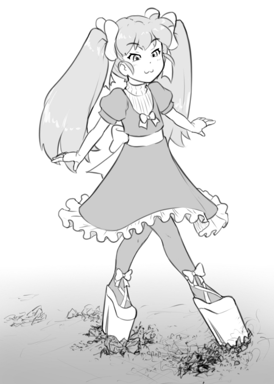 This outfit for Tilda looks fantastic! I really like the aesthetic, it's even got some nice small details like the fingerless arms-length wraps. Cute bows, frills, and everything! Even a fancier form of her platform high heels, reminiscent of Madoka's shoes. Tilda's very happy with it too... as well as her immense size, my goodness! Those massively impactful stomps are wreaking havoc upon the Earth below, damn. The itty-bitty cities being shifted around on the chunks of land makes for an awesome visual even with this level of detail, that's shockingly thorough for the scale and sketchiness. I like the trail of destruction in her wake as well. Gigatilda truly is the best.