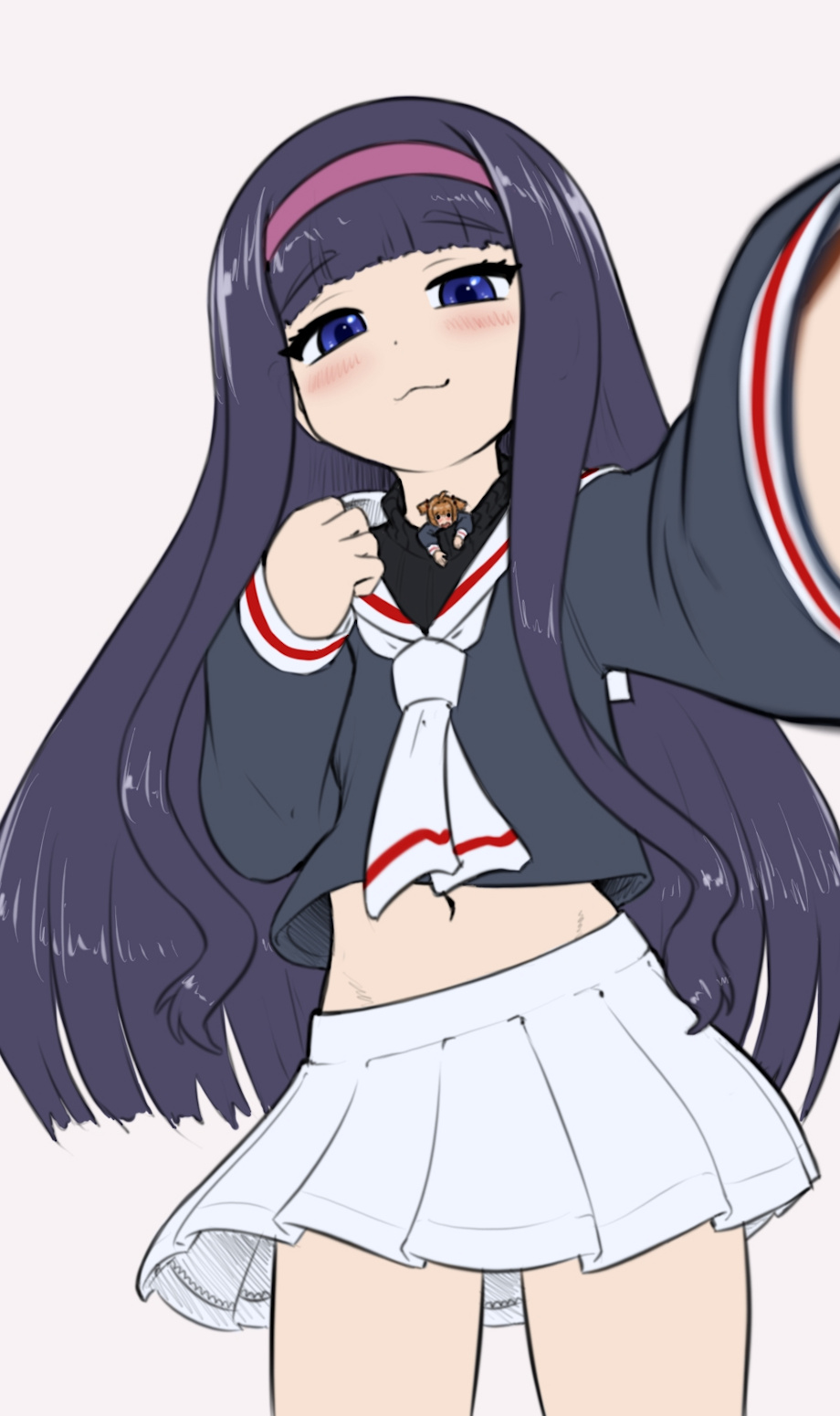 CUTE, this is a wonderful take on the tiny Sakura and Tomoyo idea. Sakura's squeaky "hoeeee"s in her collar would be precious, and I love the way Tomoyo is deciding to record all this. The tug at the collar, her extremely good accomplished smile and blush, all super great ways to highlight how much happiness Tomoyo is getting out of this! The incidental tummypeek too, I think you did fantastically on rendering all the different parts of her uniform and how her posing and tugging affects the material. Tomoyo's hair looks super pretty and finely shaped out as well!