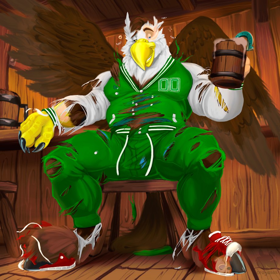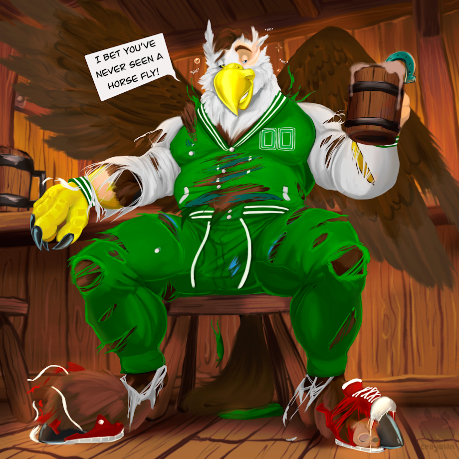 ...Pheagle sure thinks they can, especially when their front half is of an eagle! And he's too drunk to realize he's turning into one himself, shredding through his clothes like paper!