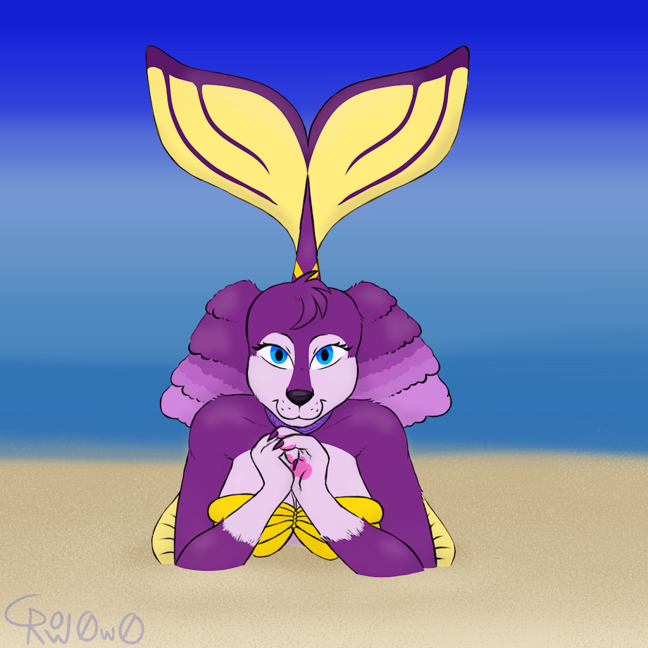 A raffle prize I received from Flauschigen Flauschigen from their art raffle in October 2024 who drawn a fullbody of Merpup marina in a cute exciting pose on the ocean floor as she’s very chuffed to see you after you keep bumping into her on any occasion inside or outside of puplantis.