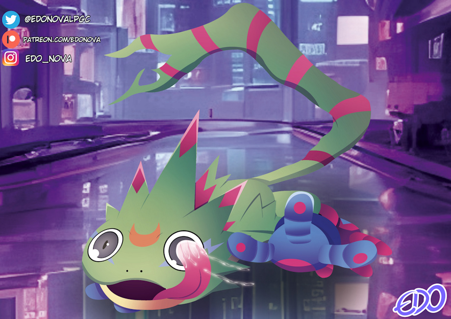 Poco sabemos de este nuevo Digimon protagónico, lo único que sabemos es que será compañero del protagonista, le gusta morder, y se humedece los ojos con la lengua, como buen geko que es. Además de ello, se ve que es muy niño e hiperactivo, contrastando bastante con la aparente personalidad madura del protagonista, que parece que le va a tener que aguantar las tonterías.