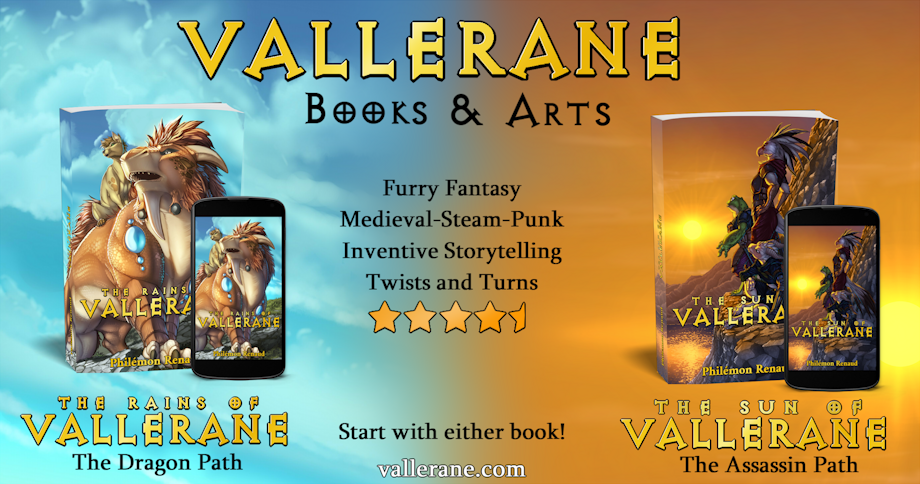 What is this saga? Stories of Vallerane is my book saga. It is set in a Fantasy-Medieval-Punk-Furry universe and follows the path of many of my characters! Cool! Where do I start? I am writing my saga so there are 2 possible paths for reading it! Each path will take 2 books and reunite in one final book. The reader can choose which one to follow first without being spoiled for the other. And what are the 2 Paths? The Path of the dragon, following the drake Hayo and his doggo friend Lahiti, and starting with “The Rains of Vallerane”. The Path of the Assassin, following the steps of the kobold Loren and her allies of circumstances, the secretary bird Rejane and the frog Soma, starting with “The Sun of Vallerane”. Hmmm I dunno… Give me 5 good reasons to read your books. Sure! - An original Fantasy-Medieval-Punk universe Vallerane gives many occasions for you to get great imagery in your head! A medieval world where technology is booming out of control, where people build houses on top of others with no limits, create weird machines full of cogs and springs, and add twists to their weapons. There are also these Tuning Forks which can interact with the Vibrance of anything, multiplying its power tenfold… - Strong characters of all shades of colors Far from these classic books and films where everyone is so dark and so serious, all my characters have a strong personality making all of them instantly recognizable! Having different species and strong designs for each also helps! These books aren’t for mannicheism either, and the frontier between good and evil is something that gets often crossed in Vallerane… - The books are short, efficient and self-contained. The books are around 70k-80k words long, or 300 pages. They still contain a LOT of events, as I am choosing to go for an effective story building that goes to the point. And if you’re tired of having books in the middle of a saga that end on a cliffhanger without solving any plot or subplot, forcing you to read the sequel, I am too! Each book will have its self-contained stories, going together in an overarching plot. Similar to Harry Potter books in short! - Surprises, Revelations, Strong Endings I am in love with books that have great pay-offs, where everything is built towards an ending that will DELIVER, both in spectacle and in character development. But I also love to have strong revelations that will make you look at a book a whole lot differently once these are revealed. If there is one thing that I can guarantee, it’s that you won’t know where it is all going, and that you will be amazed when you will be there ;> Expect the unexpected! - Playing with the tropes So many books with the same hero going on the same journey following the same sequence of events… in Vallerane, we scrap that! Everything is original and will get you to places you haven’t been before! And if you recognize some classic fantasy tropes… then it certainly means these will get subverted at some point >:3
