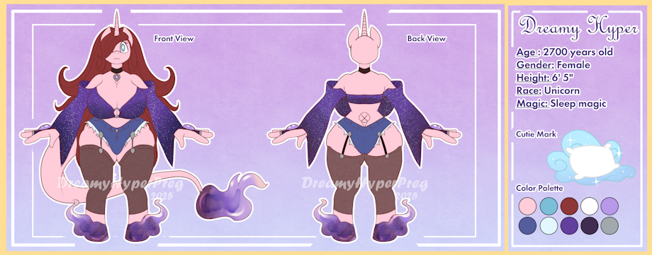 An official character sheet of my ponysona, Dreamy Hyper! I do plan to draw her in the future so be on the look out for it!
